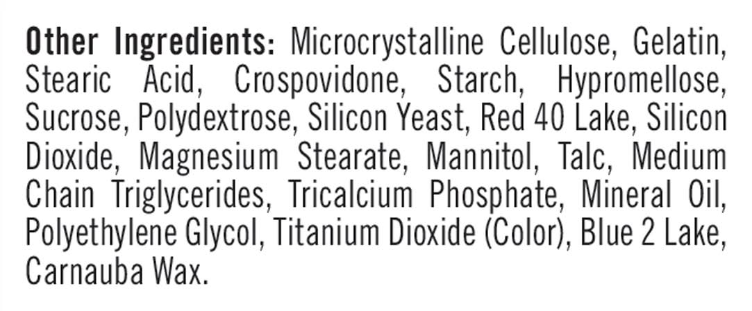 Microcrystalline Cellulose, Gelatin, Stearic Acid, Crospovidone, Starch, Hypromellose, Sucrose, Polydextrose, Silicon Yeast, Red 40 Lake, Silicon Dioxide, Magnesium Stearate, Mannitol, Talc, Medium Chain Triglycerides, Tricalcium Phosphate, Mineral Oil, Polyethylene Glycol, Titanium Dioxide (Color), Blue 2 Lake, Carnauba Wax Contains: Soyabeans Additives: None