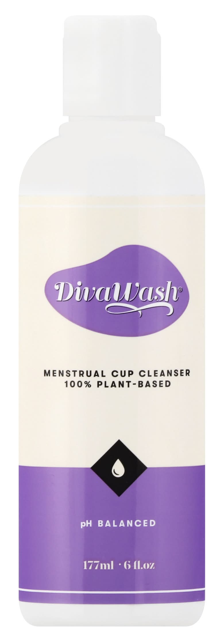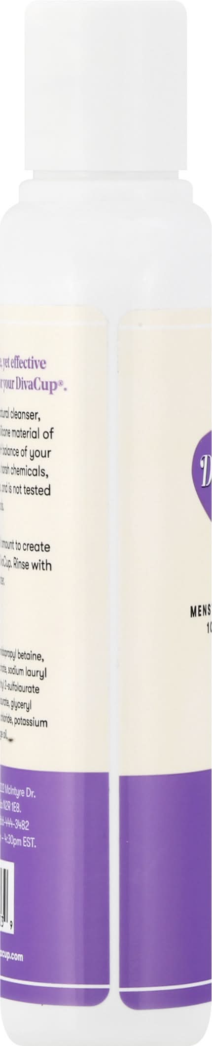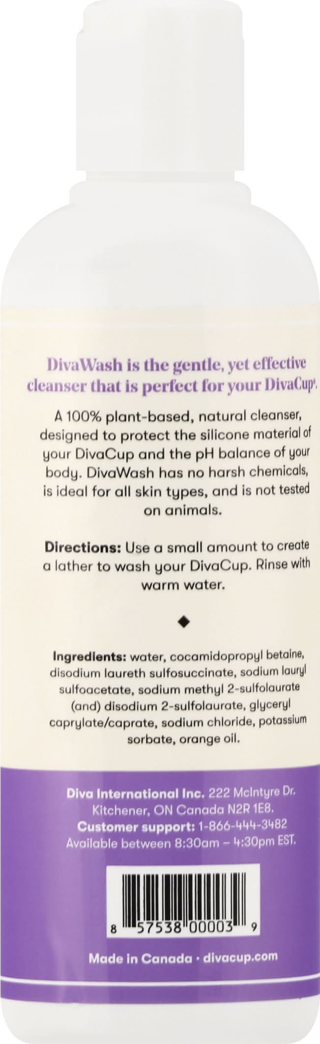 100% plant based. pH balanced. DivaWash is the gentle, yet effective cleanser that is perfect for your DivaCup. A 100% plant-based, natural cleanser, designed to protect the silicone material of your DivaCup and the pH balance of your body. DivaWash has no harsh chemicals, is ideal for all skin types, and is not tested on animals. divacup.com. Customer Support: 1-866-444-3482. Available between 8:30 am - 4:30 pm EST. Made in Canada. Diva International,