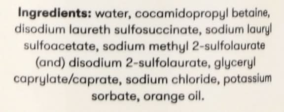 Water, Cocamidopropyl Betaine, Disodium Laureth Sulfosuccinate, Sodium Lauryl Sulfoacetate, Sodium Methyl 2-Sulfolaurate (and) Disodium 2-Sulfolaurate, Glyceryl Caprylate/Caprate, Sodium Chloride, Potassium Sorbate, Orange Oil.