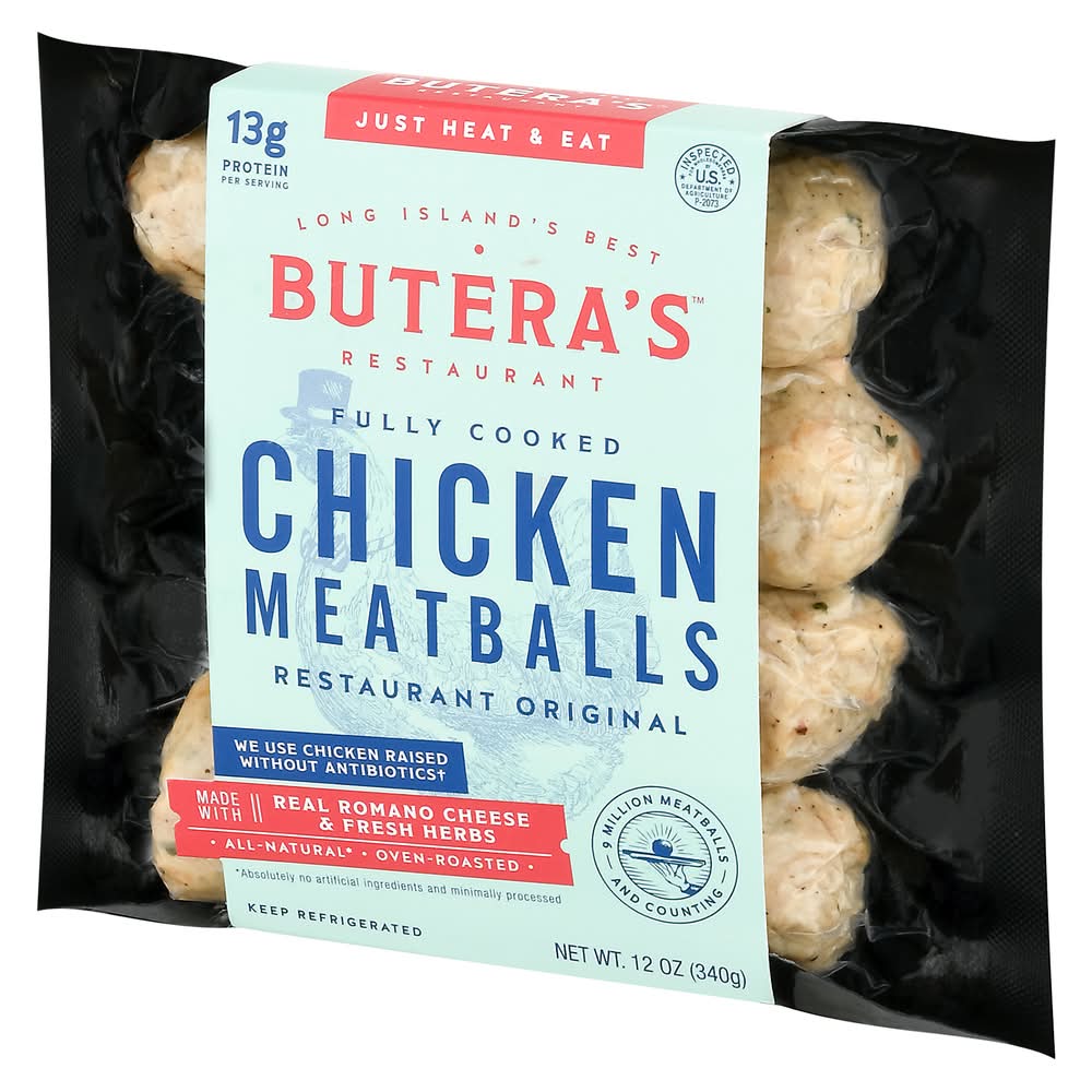 13 g protein per serving. We use chicken raised without Antibiotics (Federal regulations prohibit the use of growth hormones in chicken). No nitrites or nitrates & no preservatives. Just heat & eat. Long Island's best. Restaurant. Fully cooked. Restaurant original. Oven roasted. 9 Million meatballs and counting. Over nine million meatballs & counting. Meatballs are irresistible. We've been making so many of them over the last 20 years at Butera's Restaurant, that they've become an icon of gustatory joy for thousands of Long Islanders. We've elevated the meatball to its ultimate, savory, round perfection. You don't have to be on 'the Island' to enjoy our mouth-watering meatballs anymore - now you can enjoy Butera's Meatballs anywhere, anytime. Inspected for wholesomeness by U.S. Department of Agriculture. buterasrestaurant.com. buterasrestaurant.com. Instagram (at)buterasmeatballs. Facebook Butera's Meatballs. Butera's Fine Foods, LLC,