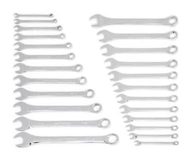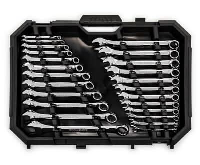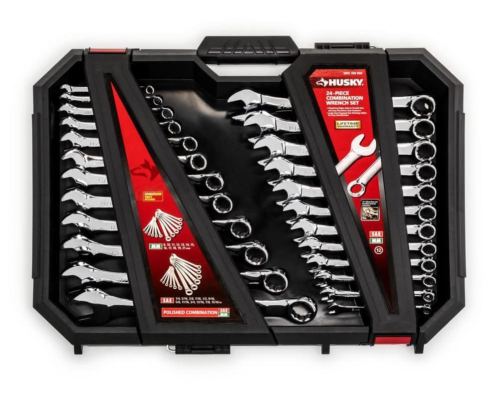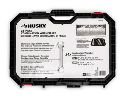 The Husky SAE/MM Combination Wrench Set includes 24 combination wrenches in packaging that doubles as a storage rack. The storage rack allows you to neatly place the wrenches in your storage drawer/chest for easy organization. Husky combination wrenches are forged from chrome alloy steel for outstanding durability and strength for a lifetime of use. Each wrench has an open end for access to fasteners in tight spaces and a 12-point box end to get a secure grip on fasteners when added torque is needed. No toolbox or workshop of the DIYer or professional would be complete without a this set of combination wrenches from Husky.