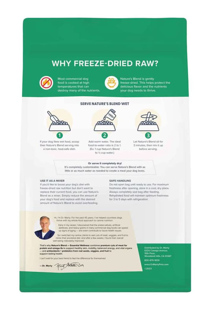 America’s Foremost Integrative Veterinarian For more than four decades, I’ve helped countless dogs thrive with my unique raw food method. And now, I’ve crafted a premium food blend for dog parents to share with their furry friends at home. You see, many dog food brands use high heat to cook their kibble, which unfortunately destroys most of the nutrients. My freeze-dried raw method keeps as many nutrients intact as possible. Each batch is made from all-natural ingredients, and contains multiple protein sources and essential vitamins and minerals to help keep dogs healthy and happy... for years to come. As a leading voice in veterinary medicine, I’m thrilled I can finally share my canine health formulas with the world — and I can’t wait to share ALL my exciting work with you. Your dedicated partner in canine care, Dr. Martin Goldstein. Dr. Marty Nature's Blend is premium, freeze-dried raw dog food formulated to support the health, happiness, and longevity of all adult dogs. Turkey, beef, salmon, and duck first four ingredients Zero artificial perservatives, additives, fillers or synthetic ingredients. Use it as a mixer- If you'd like to boost your dog's diet with freeze-dried raw nutrition but don't want to replace their current food, you can use Nature's Blend as a mixer. Simply reduce the amount of Nature's Blend to avoid overfeeding.