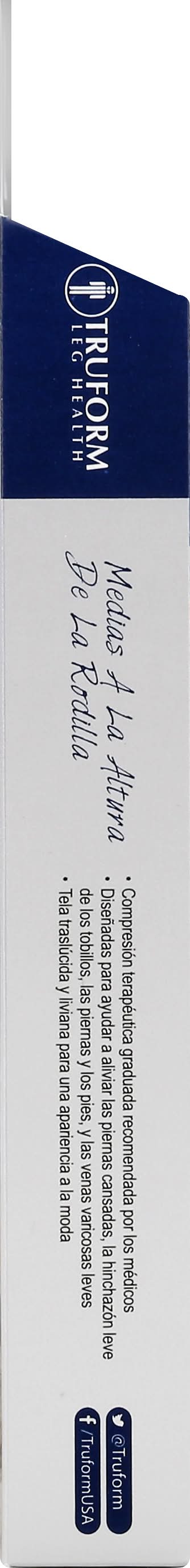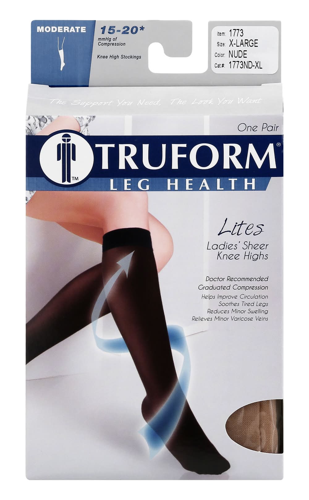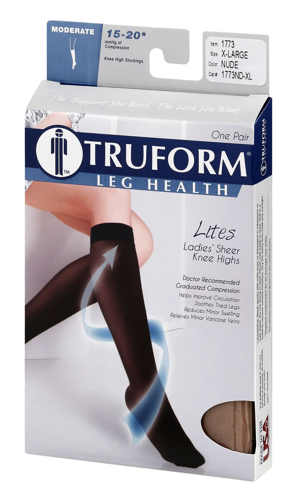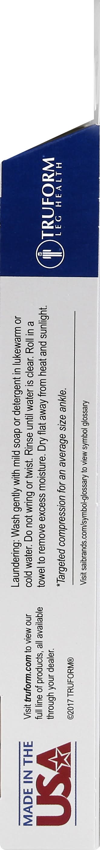 15-20 (Targeted compression for an average size ankle) mmHg of Compression. The support you need. The look you want. Doctor recommended. Graduated compression. Helps improve circulation soothes tired legs reduces minor swelling relieves minor varicose veins. Mild 8-15mmhg: Leg fatigue. Slight leg, ankle, and foot swelling. Moderate 15-20mmhg: Tired legs. Minor varicose veins. Minor leg, ankle, and foot swelling. Post surgery. Firm 20-30mmhg. Tired, aching legs. Moderate varicose veins. Moderate leg, ankle, and foot swelling. Post surgery. Extra-Firm 30-40mmhg: Pronounced varicose veins. Pronounced leg, ankle, and foot swelling. Chronic poor circulation. Post sclerotherapy and surgery. Truform Sheer utilize graduated compression to energize legs - ideal when sitting or standing for extended periods. All day relief from tired legs. Minor swelling, minor varicose veins and related conditions. Reinforced toe, knit-in heel pocket and soft band for durability, comfort and proper fit. As sheer as fine hosiery, yet long lasting. Available in the most popular colors. Small: Circumference: Ankle (7 Inches - 8-1/4 Inches / 17.75 - 21 cm), Calf (11 Inches - 15 Inches / 28 - 38 cm); Medium: Circumference: Ankle (8-1/4 Inches - 9-1/2 Inches / 21 - 24 cm), Calf (11-3/4 Inches - 16-1/2 Inches / 29.75 - 42 cm); Large: Circumference: Ankle (9-1/2 Inches - 10-3/4 Inches / 24 - 27.25 cm), Calf (12-1/2 Inches - 18 Inches / 31.75 - 45.75 cm); X-Large: Circumference: Ankle (10-3/4 Inches - 12 Inches / 27.25 - 30.5 cm), Calf (13 Inches - 19 Inches / 33 - 48.25 cm); 2X-Large: Circumference: Ankle (12-1/2 Inches - 13-3/4 Inches / 31.75 - 35 cm), Calf (19-1/2 Inches - 22 Inches / 49.5 - 56 cm); 3X-Large: Circumference: Ankle (12-1/2 Inches - 13-3/4 Inches / 31.75 - 35 cm), Calf (21-1/2 Inches - 24 Inches / 54.5 - 61 cm). Measure around the smallest part of the ankle and the widest flare of the calf. A health care professional should be consulted to evaluate, diagnose, and recommend appropriate compression therapy. CE Listed. truform.com. saibrands.com/symbol-glossary. Twitter. (at)Truform. Facebook. Facebook/TruformUSA. To learn more about Truform, scan for informative video. Visit truform.com to view our full line of products, all available through your dealer. Visit saibrands.com/symbol-glossary to view symbol glossary. Available Colors: White, Ivory, Light Beige, Beige, Nude, Taupe, Navy, Charcoal, Black. Made in the USA. Surgical Appliance Industries, Inc.,