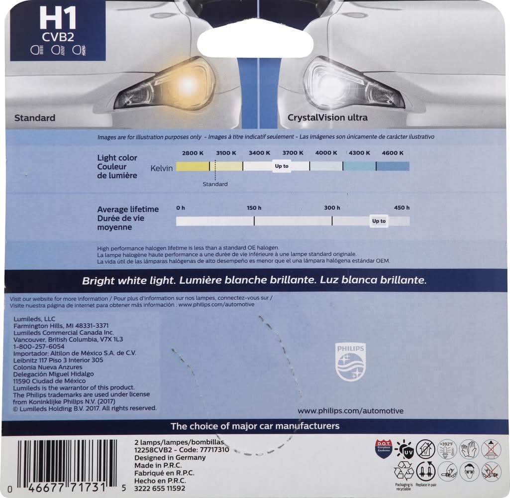 55 w. Standard. Images are for illustration purposes only. Light color: Kelvin: 2800 k, standard 3100 k, 3400 k up to 3700 K, 4000 k, 4300 k, 4600 k. Average lifetime: 0 h, 150 h, 300 h up to 450 h. High performance halogen lifetime is less than a standard OE halogen. The choice of major car manufacturers. Designed in Germany. 392 degrees F. Replace in pair. Lumileds is the warrantor of this product. Original Equipment Quality 1914. www.philips.com/automotive. Visit our website for more information: www.philips.com/automotive. Packaging is recyclable. Made in P.R.C. Lumileds, LLC,