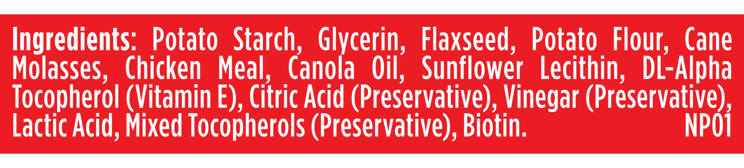 Potato Starch, Glycerin, Flaxseed, Potato Flour, Cane Molasses, Chicken Meal, Canola Oil, Sunflower Lecithin, Dl-alpha Tocopherol (vitamin E), Citric Acid (preservative), Vinegar (preservative), Lactic Acid, Mixed Tocopherols (preservative), Biotin.