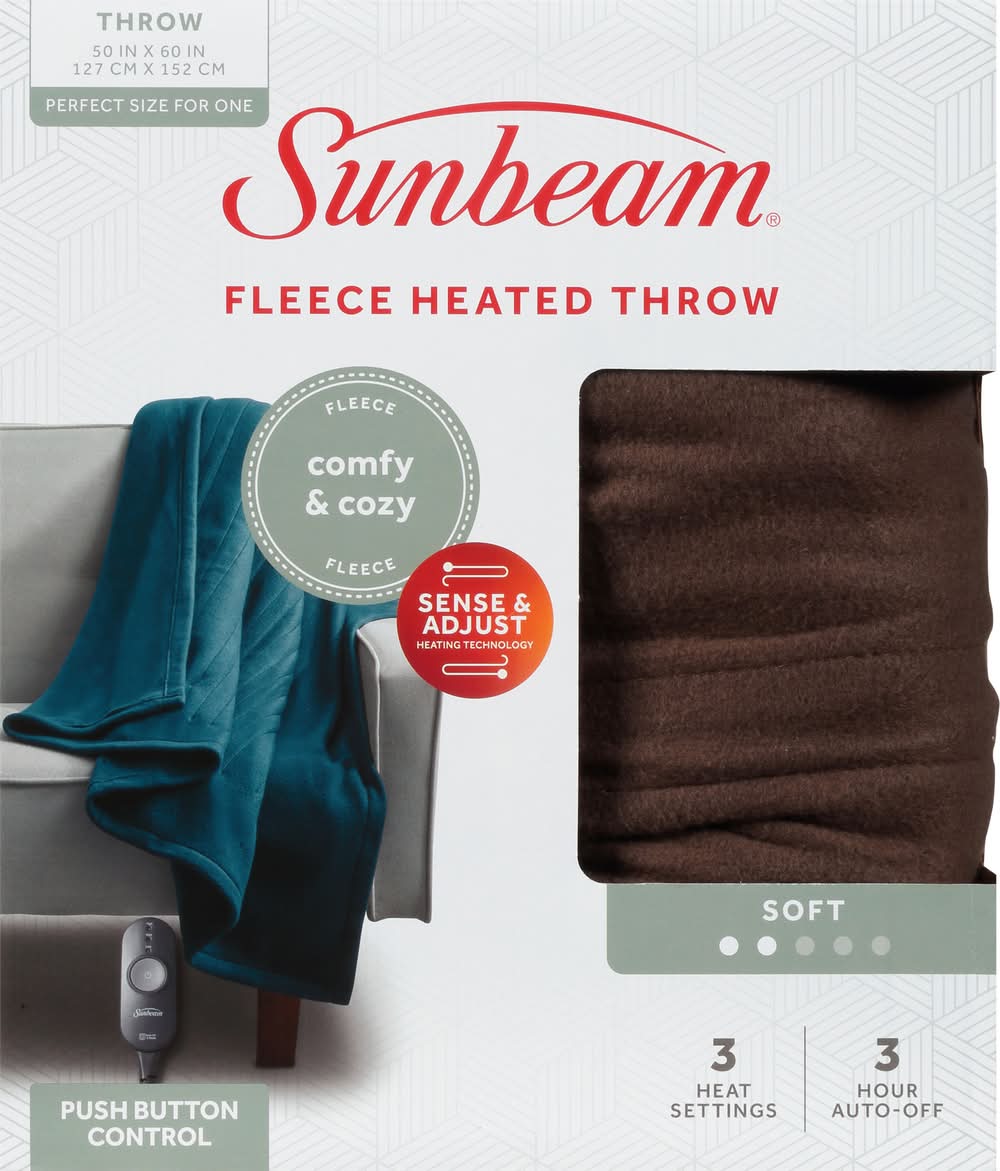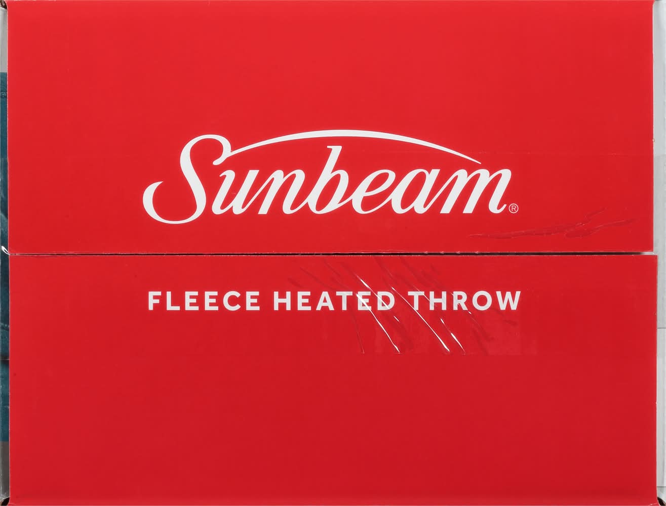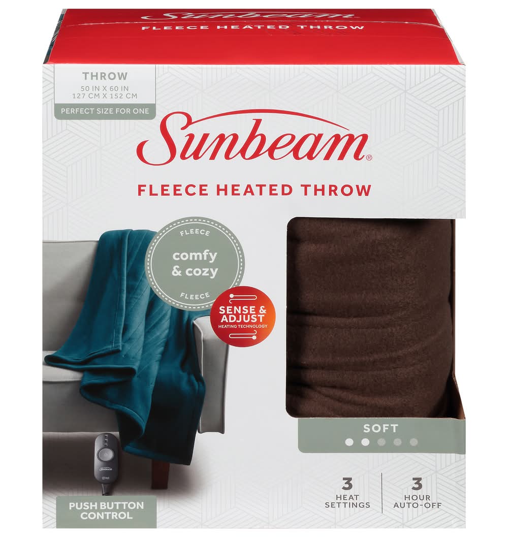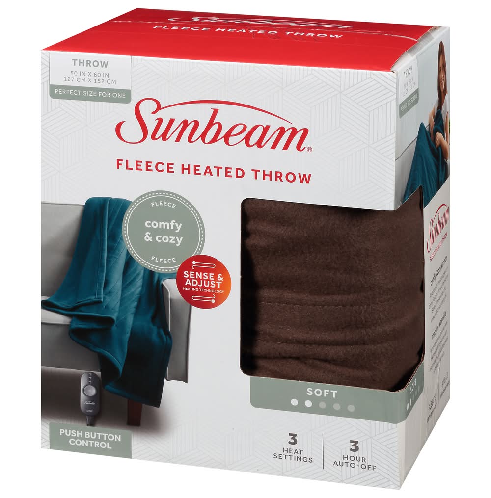 50 in x 60 in (127 cm x 152 cm). Perfect size for one. Comfy & cozy fleece. Sense & adjust heating technology. Push button control. 3 heat settings. 3 hour auto-off. The Sunbeam Advantage: Rest easy knowing that the heart of your throw, the heated wire, is made with premium components. It provides fast, even warmth and has features to help prevent overheating. Dual safety circuits helps to monitor the throw's operations during use. Heated wire technology senses and adjusts for continuous heat. Simple Push Button Control: 3 heat settings; 3 hour auto-off. Comfy & Cozy Warmth: Perfect size for one to snuggle up in comfy Fleece on the couch or recliner! Shake off those winter chills while saving on your energy bill. Due to continuing product development, product inside may look slightly different. 5 year limited warranty. UL listed. www.sunbeam.com. Made in China. Sunbeam Products, Inc.,