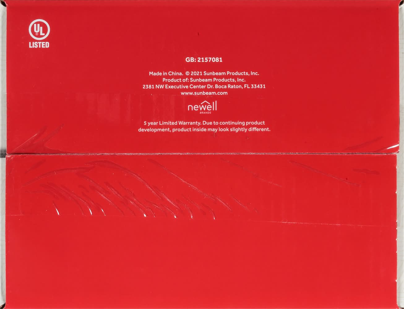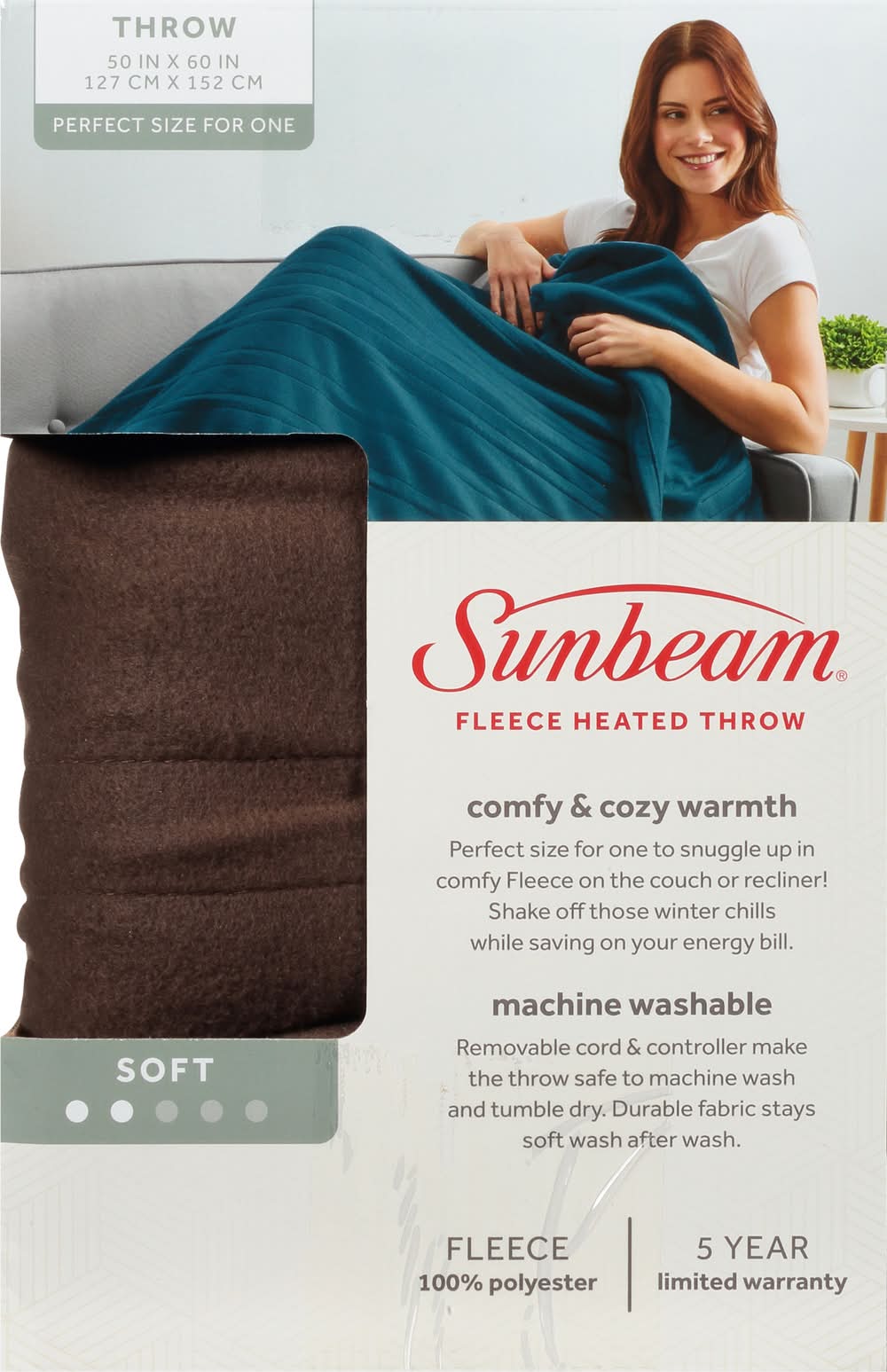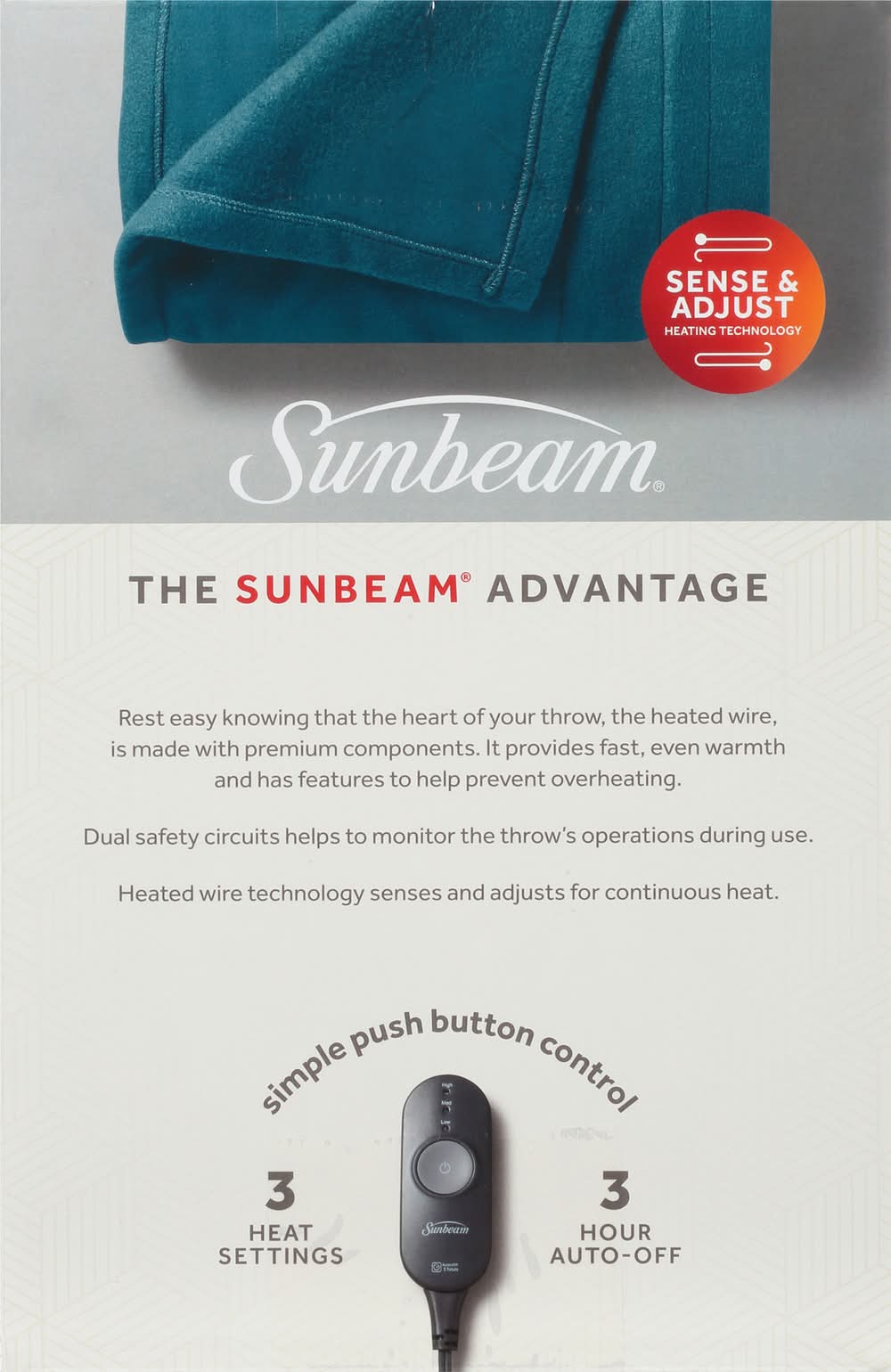 50 in x 60 in (127 cm x 152 cm). Perfect size for one. Comfy & cozy fleece. Sense & adjust heating technology. Push button control. 3 heat settings. 3 hour auto-off. The Sunbeam Advantage: Rest easy knowing that the heart of your throw, the heated wire, is made with premium components. It provides fast, even warmth and has features to help prevent overheating. Dual safety circuits helps to monitor the throw's operations during use. Heated wire technology senses and adjusts for continuous heat. Simple Push Button Control: 3 heat settings; 3 hour auto-off. Comfy & Cozy Warmth: Perfect size for one to snuggle up in comfy Fleece on the couch or recliner! Shake off those winter chills while saving on your energy bill. Due to continuing product development, product inside may look slightly different. 5 year limited warranty. UL listed. www.sunbeam.com. Made in China. Sunbeam Products, Inc.,