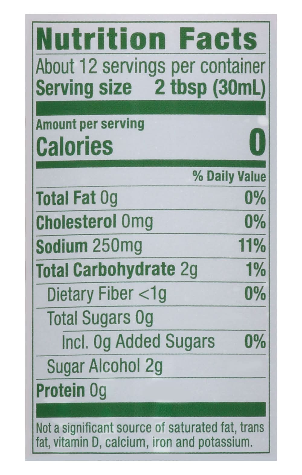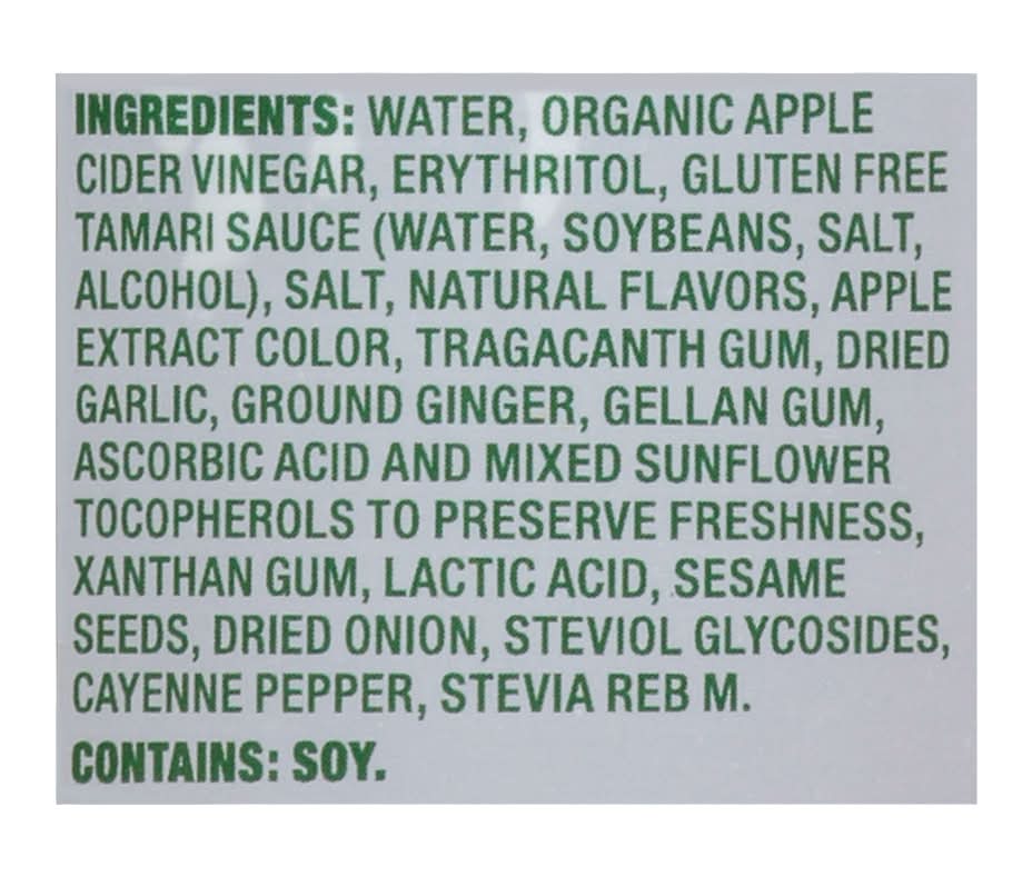 Water, Organic Apple Cider Vinegar, Erythritol, Gluten Free Tamari Sauce Water, Soybeans, Salt, Alcohol, Salt, Natural Flavors, Apple Extract Color, Tragacanth Gum, Dried Garlic, Ground Ginger, Gellan Gum, Ascorbic Acid and Mixed Sunflower Tocopherols to Preserve Freshness, Xanthan Gum, Lactic Acid, Sesame Seeds, Dried Onion, Steviol Glycosides, Cayenne Pepper, Stevia Reb M. Contains: 'Contains Soybeans', 'Contains Sesame' Additives: None