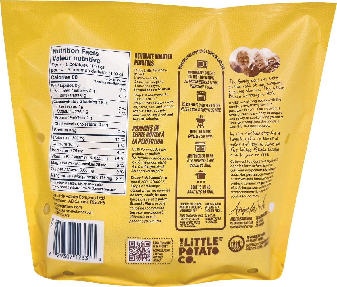 Gluten free. The only thing you'll need to peel. Ready in as little as 5 mins. Enjoy the little things. Always pre-washed. A fresh whole food. 6 servings per bag. The family bond has been at the root of our company since we started The Little Potato Company in 1996. It still lives strong today with the family farms that grow our potatoes for you. Our nutritious little potatoes are easy to prepare and ready to cook, giving you more time to strengthen the bonds in your life. We hope you do. - Angela Santiago, Co-Founder and CEO. Jacob Van Der Schaaf, Co-Founder. Sustainably grown on family farms. A fun, fresh whole food. LittlePotatoes.com. Scan for more easy recipes. The Little Potato,