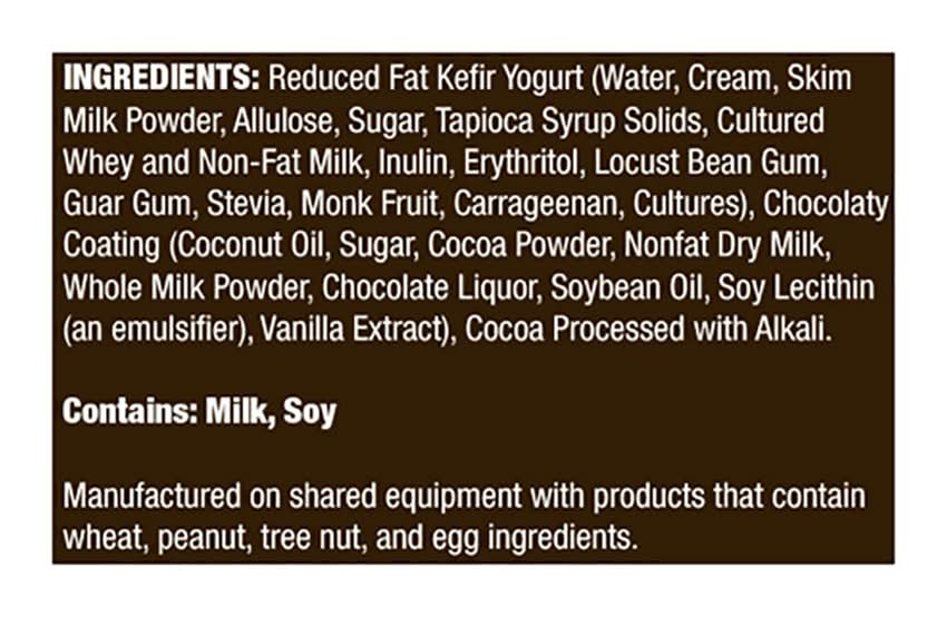 Reduced Fat Kefir Yogurt (Water, Cream, Skim Milk Powder, Allulose, Sugar, Tapioca Syrup Solids, Cultured Whey and Non-Fat Milk, Inulin, Erythritol, Locust Bean Gum, Guar Gum, Stevia, Monk Fruit, Carrageenan, Cultures), Chocolaty Coating (Coconut Oil, Sugar Cocoa Powder, Nonfat Dry Milk, Whole Milk Powder, Chocolate Liquor, Soybean Oil, Soy Lecithin (an Emulsifier), Vanilla Extract), Cocoa Processed with Alkali. Contains: Milk, Soybeans, Tree Nuts, Coconuts, Wheat, Peanuts, Tree Nuts, Eggs