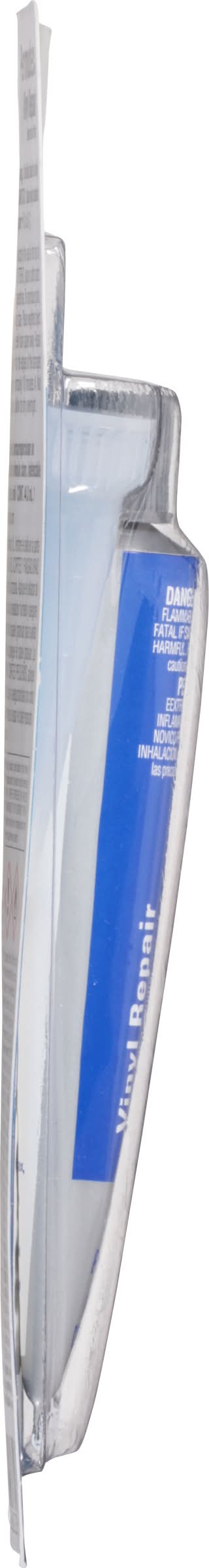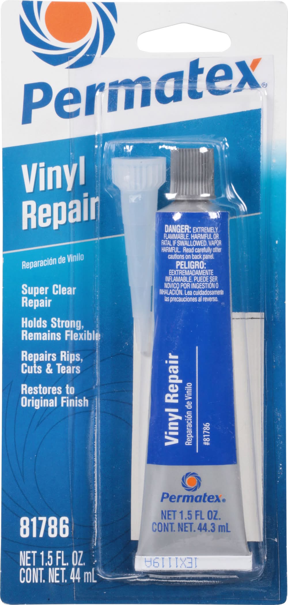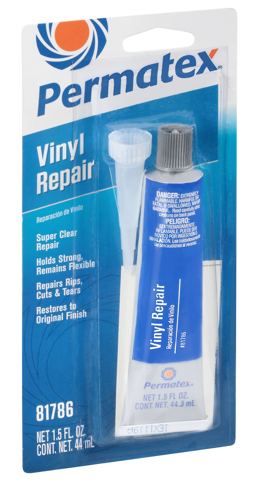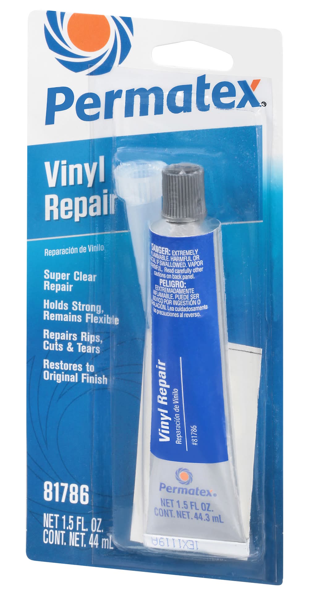 Kit Contains: 1 tube vinyl sealant - net 1.5 fl. oz. (44.3 ml), 1 applicator nozzle, 1 sheet grain paper - 1-3/4 inch x 3-1/2 inch. Super clear repair. Holds strong, remains flexible. Repairs rips, cuts & tears. Restores to original finish. Permatex vinyl repair is specially formulated to provide a strong, yet flexible bond to vinyl surfaces. Forms a clear, undetectable and waterproof bond. Warranty and Limited Liability: Permatex warrants that each Permatex product meets the applicable product specification at the time of shipment. If the Permatex product does not conform to this warranty, at the discretion of Permatex, a replacement of product may be offered as the sole and exclusively remedy and Permatex's sole and exclusive liability. Permatex makes no other expressed or implied warranties or conditions, including any implied warranty or condition of merchantability or suitability for a particular purpose. Limitation of Liability: Except where prohibited by law, Permatex will not be liable for any loss or damage arising from the use of the Permatex product, whether direct, indirect, special, incidental or consequential, regardless of legal theory asserted. www.permatex.com. Toll Free: 866-732-9502 Assembled in U.S.A. with U.S. and global materials. Illinois Tool Works Inc.,