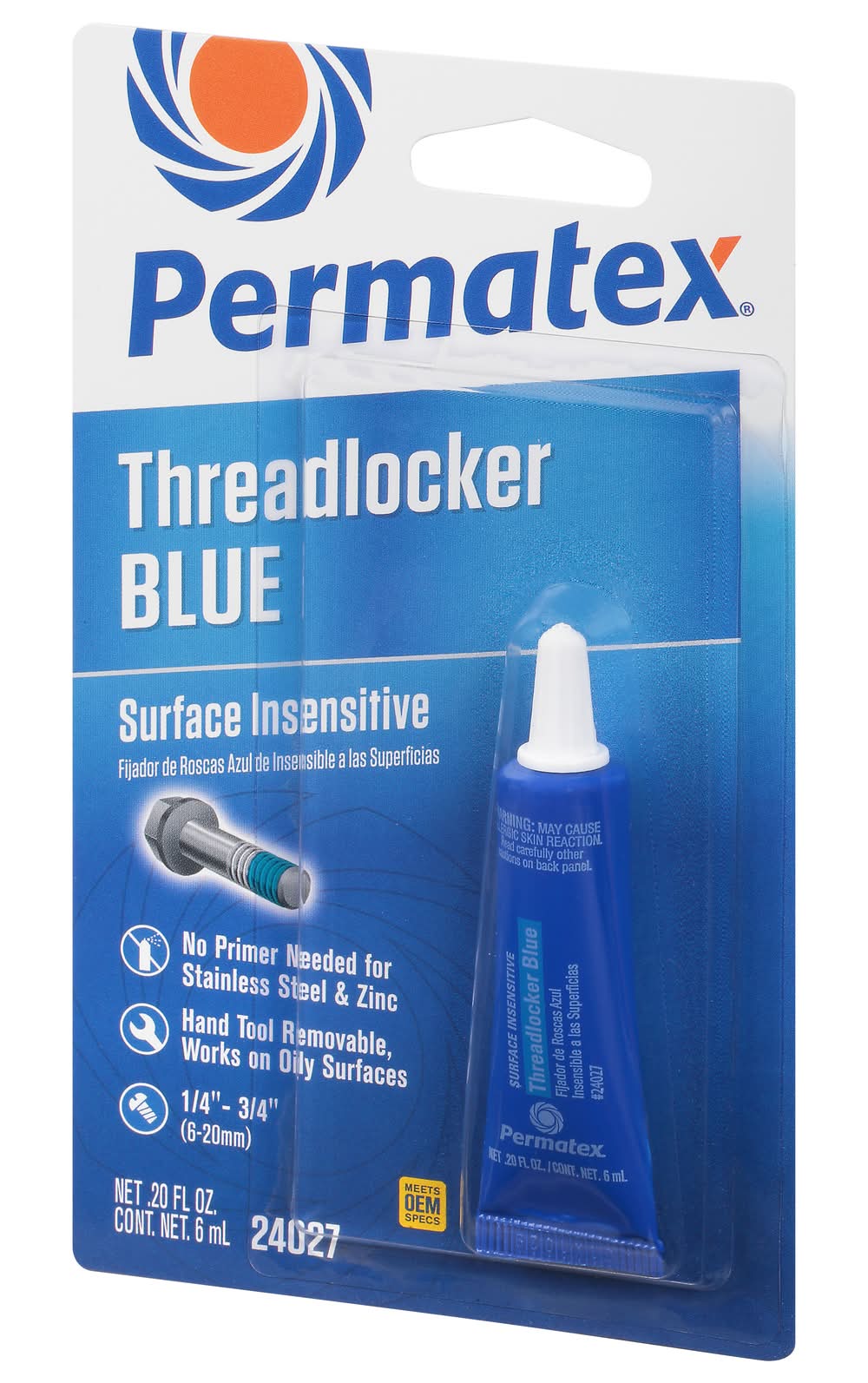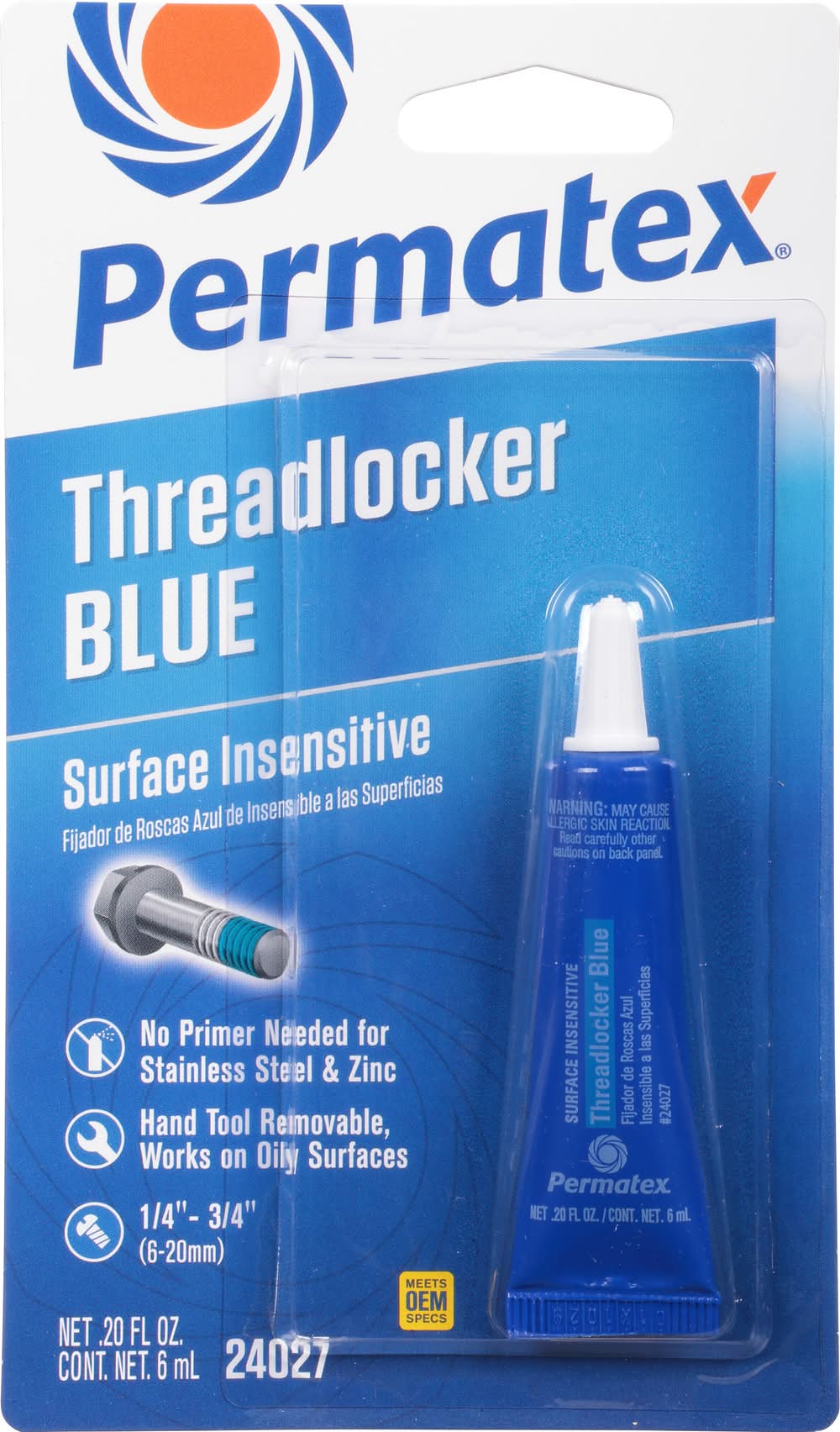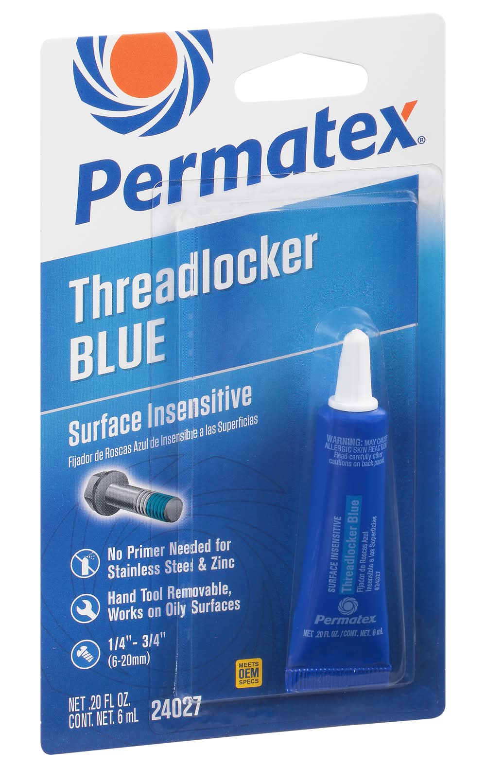 No primer needed for stainless steel & zinc. Hand tool removable, works on oily surfaces. 1/4 in. - 3/4 in. (6-20 mm). Product Name: Low Strength; Color: Purple; Fastener Size: Up to 1/4 in. (up to 6mm); Torque (in. lbs.) Break/Prevail: 55 / 20; Shear Strength: 500 psi; Maximum Temperature: +300 degrees F (+149 degrees C); Common Applications: Set screws, calibration screws, adjustment screws, meters and gauges; When to Apply: Before assembly. Product Name: Medium Strength; Color: Blue; Fastener Size: Up to 1/4 in. to 3/4 in. (6 mm to 20 mm); Torque (in. lbs.) Break/Prevail: 155 / 50; Shear Strength: NA; Maximum Temperature: +300 degrees F (+149 degrees C); Common Applications: Machine tools and presses, pumps and compressors, mounting bolts, and gear boxes; When to Apply: Before assembly. Product Name: Surface Insensitive; Color: Blue; Fastener Size: Up to 1/4 in. to 3/4 in. (6 mm to 20 mm); Torque (in. lbs.) Break/Prevail: 155 / 50; Shear Strength: NA; Maximum Temperature: +300 degrees F (+149 degrees C); Common Applications: Rocker studs, adjustment bolts, valve & cam cover bolts, disc brake calipers, alternator & pulley assembles; When to Apply: Before assembly. Product Name: Permanent Strength; Color: Red; Fastener Size: 3/8 in. to 1 in. (10 to 25 mm); Torque (in. lbs.) Break/Prevail: 190 / 275; Shear Strength: 2250 psi; Maximum Temperature: +300 degrees F (+149 degrees C); Common Applications: Cylinder block bolts, ring gear bolts, and transmission stud bolts; When to Apply: Before assembly. Product Name: High Strength; Color: Red; Fastener Size: 3/8 in. to 1 in. (10 to 25 mm); Torque (in. lbs.) Break/Prevail: 250 / 250; Shear Strength: NA; Maximum Temperature: +300 degrees F (+149 degrees C); Common Applications: Cylinder block and rocker arm studs, shock absorber mounts and ring gear bolts; When to Apply: Before assembly. Product Name: High Temperature; Color: Red; Fastener Size: 3/8 in. to 1.5 in. (10 to 38 mm); Torque (in. lbs.) Break/Prevail: 200 / 225; Shear Strength: 3000 psi; Maximum Temperature: +300 degrees F (+149 degrees C); Common Applications: Camshaft sprocket bolts, idler bearings, transmission input/.output shaft threads, ring gear or shock bolts; When to Apply: Before assembly. Product Name: Penetrating Grade; Color: Green; Fastener Size: no. 2 to 1/2 in. (2.2 to 12 mm); Torque (in. lbs.) Break/Prevail: 65 / 225; Shear Strength: 1500 psi; Maximum Temperature: +300 degrees F (+149 degrees C); Common Applications: Preassembled fasteners instrumentation screws, electrical connectors, carburetors; When to Apply: After assembly. Permatex threadlockers fixture in approximately 20 minutes and are fully cured within 24 hours. Permatex surface prep activator reduces fixture time to 5 minutes. Preceding values are for 3/8 in - 16 steel "as received" nuts and bolts at 72 degrees F (22 degrees C). Meets OEM specs. www.permatex.com. Toll Free: 866-732-9502. Assembled in U.S.A. with U.S. and global materials. Illinois Tool Works Inc.,