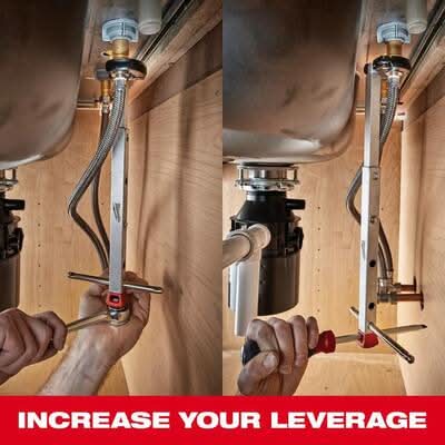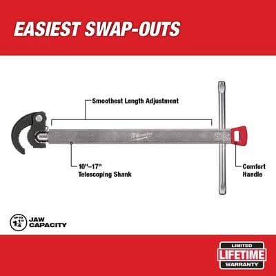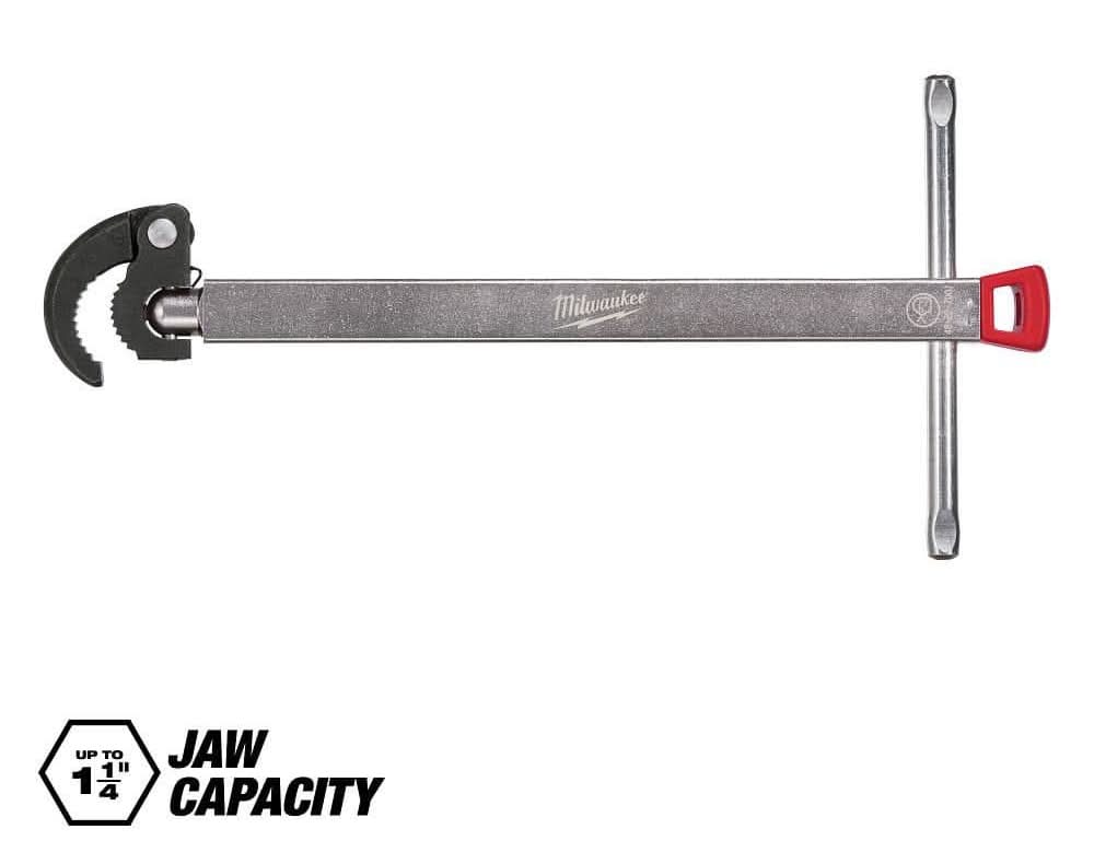 Get your next under sink application done with this Milwaukee 1.25 in. Basin Wrench. Made to be the industry's easiest basin swap-out, it's perfect for extremely tight spaces. The Milwaukee Basin Wrench offers an ergonomic handle that's designed to fit in your palm for maximum efficiency and comfort. For difficult to remove or corroded fasteners, it features a new-to-world ratchet ready and screwdriver ready handle that allows for maximum speed and break-away torque. A forged and hardened jaw with an optimized tooth pattern delivers maximum grip and durability. The telescoping handle allows for easy adjustment between handle lengths. Size: 1.25 In