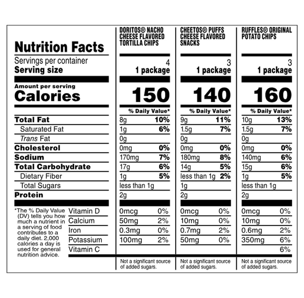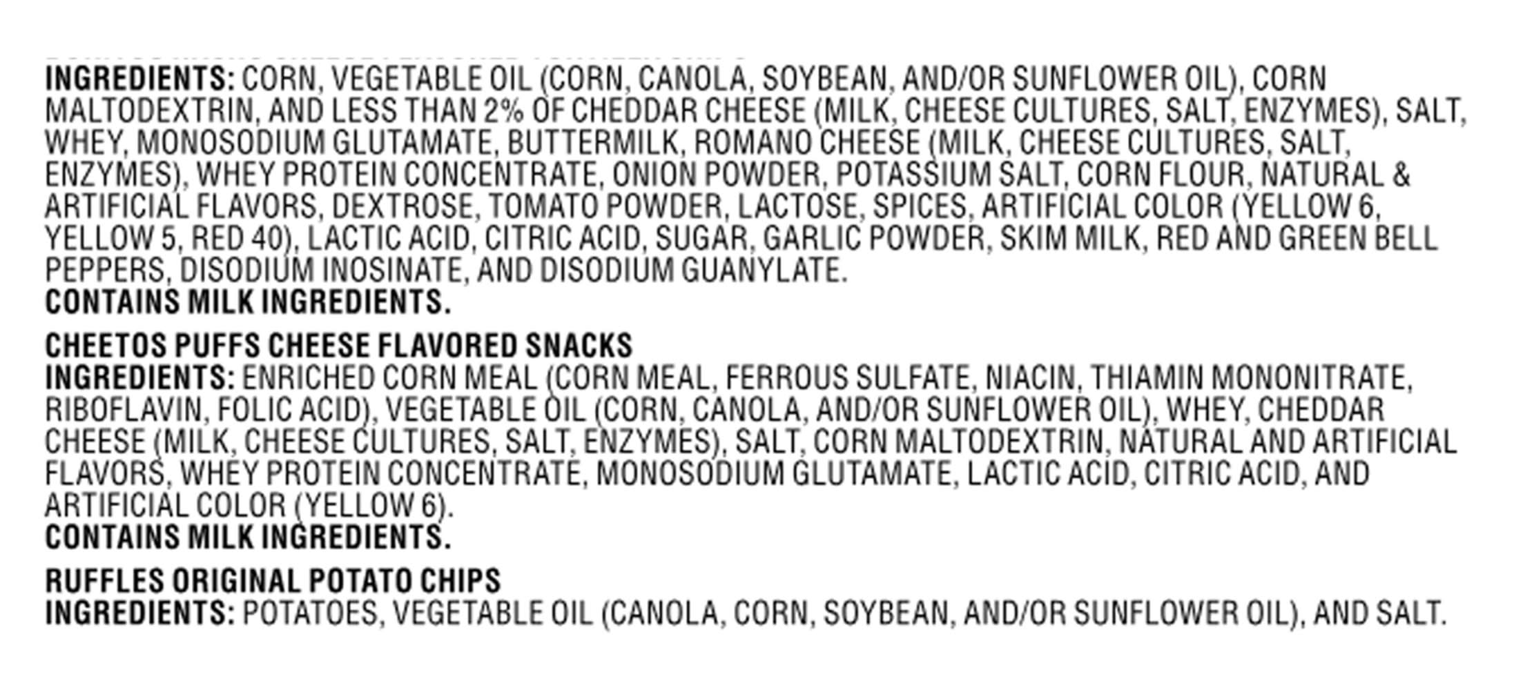 Doritos Nacho Cheese Flavored Tortilla Chips: Doritos Nacho Cheese Flavored Tortilla Chips Ingredients: Corn, Vegetable Oil (Corn, Canola, Soybean, and/or Sunflower Oil), Corn Maltodextrin, and Less than 2% of Cheddar Cheese (Milk, Cheese Cultures, Salt, Enzymes), Salt, Whey, Monosodium Glutamate, Buttermilk, Romano Cheese (Milk, Cheese Cultures, Salt, Enzymes), Whey Protein Concentrate, Onion Powder, Potassium Salt, Corn Flour, Natural & Artificial Flavors, Dextrose, Tomato Powder, Lactose, Spices, Artificial Color (Yellow 6, Yellow 5, Red 40), Lactic Acid, Citric Acid, Sugar, Garlic Powder, Skim Milk, Red and Green Bell Peppers, Disodium Inosinate, and Disodium Guanylate. Cheetos Puffs Cheese Flavored Snacks: Cheetos Puffs Cheese Flavored Snacks Ingredients: Enriched Corn Meal (Corn Meal, Ferrous Sulfate, Niacin, Thiamin Mononitrate, Riboflavin Folic Acid), Vegetable Oil (Corn, Canola, and/or Sunflower Oil), Whey, Cheddar Cheese (Milk, Cheese Cultures, Salt, Enzymes), Salt, Corn Maltodextrin, Natural and Artificial Flavors, Whey Protein Concentrate, Monosodium Glutamate, Lactic Acid, Citric Acid, and Artificial Color (Yellow 6). Raffles Original Potato Chips: Ruffles Original Potato Chips Ingredients: Potatoes, Vegetable Oil (Canola, Corn, Soybean, and/or Sunflower Oil), and Salt. Contains: Milk, Lactose, Soybeans