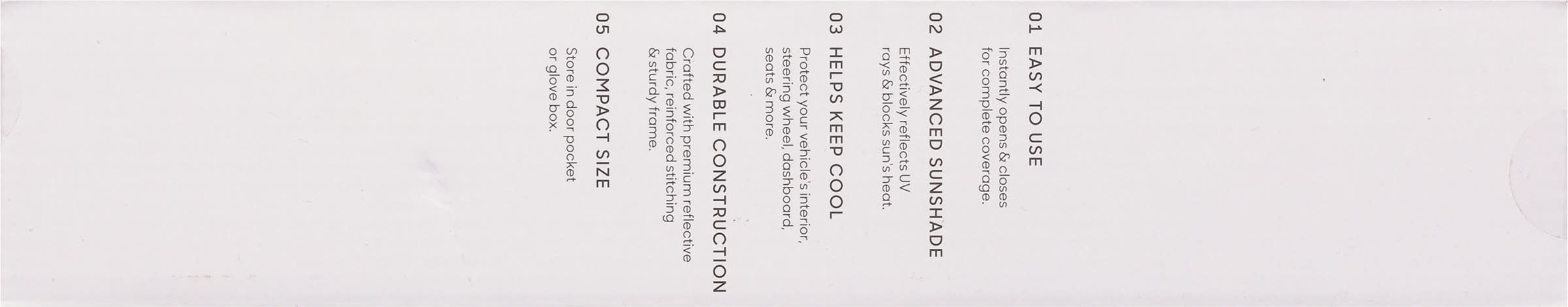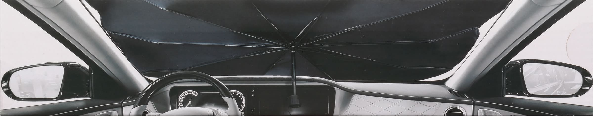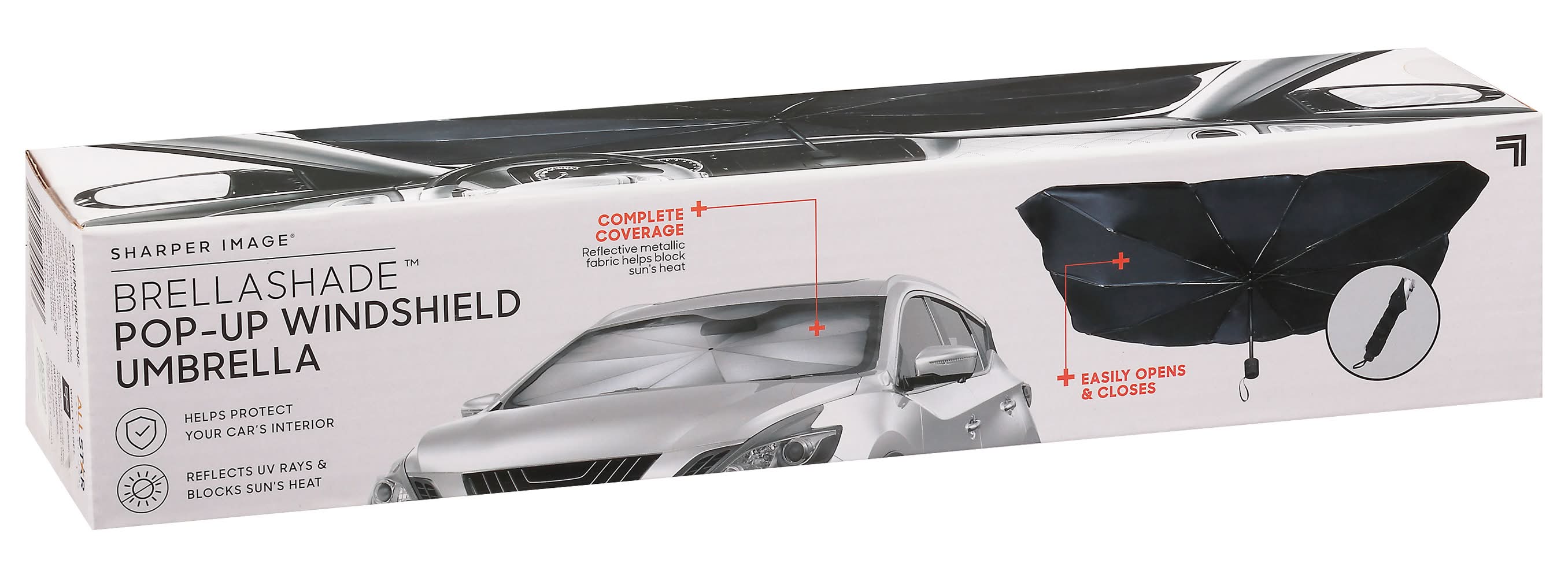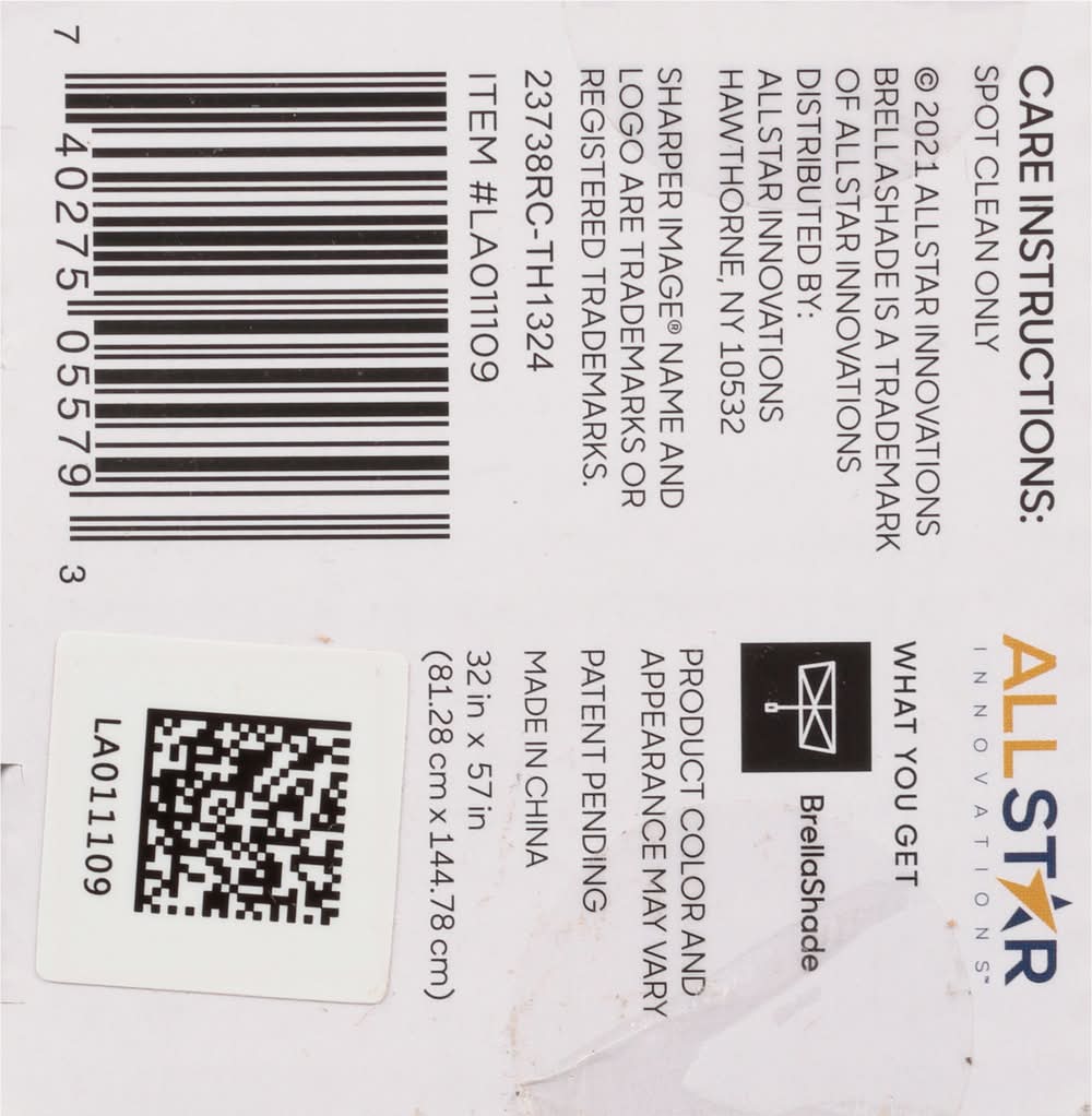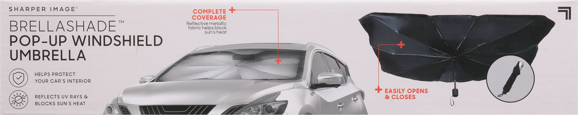 32 in x 57 in (81.28 cm x 144.78 cm). Helps protect your car's interior. Reflects UV rays & blocks sun's heat. Complete Coverage: Reflective metallic fabric helps block sun's heat. Easily opens & closes. Blocks UV rays. How it Works: BrellaShade Cover is the hassle-free way to keep cars/SUVs cool & protected from the sun. Just hold it over the dashboard and open. Flip car's visors down to secure. It is that easy. Easily closes for compact storage! Fits most cars/SUVs. What you Get: BrellaShade. Product color and appearance may vary. Tomorrow's, tomorrow. 01) Easy to Use: Instantly opens & closes for complete coverage. 02) Advanced Sunshade: Effectively reflects UV rays & block sun's heat. 03) Helps Keep Cool: Protect your vehicle's interior, steering wheel, dashboard, seats & more. 04) Durable Construction: Crafted with premium reflective fabric, reinforced stitching & sturdy frame. 05) Compact Size: Store in door pocket or glove box. Made in China. Allstar Innovations,