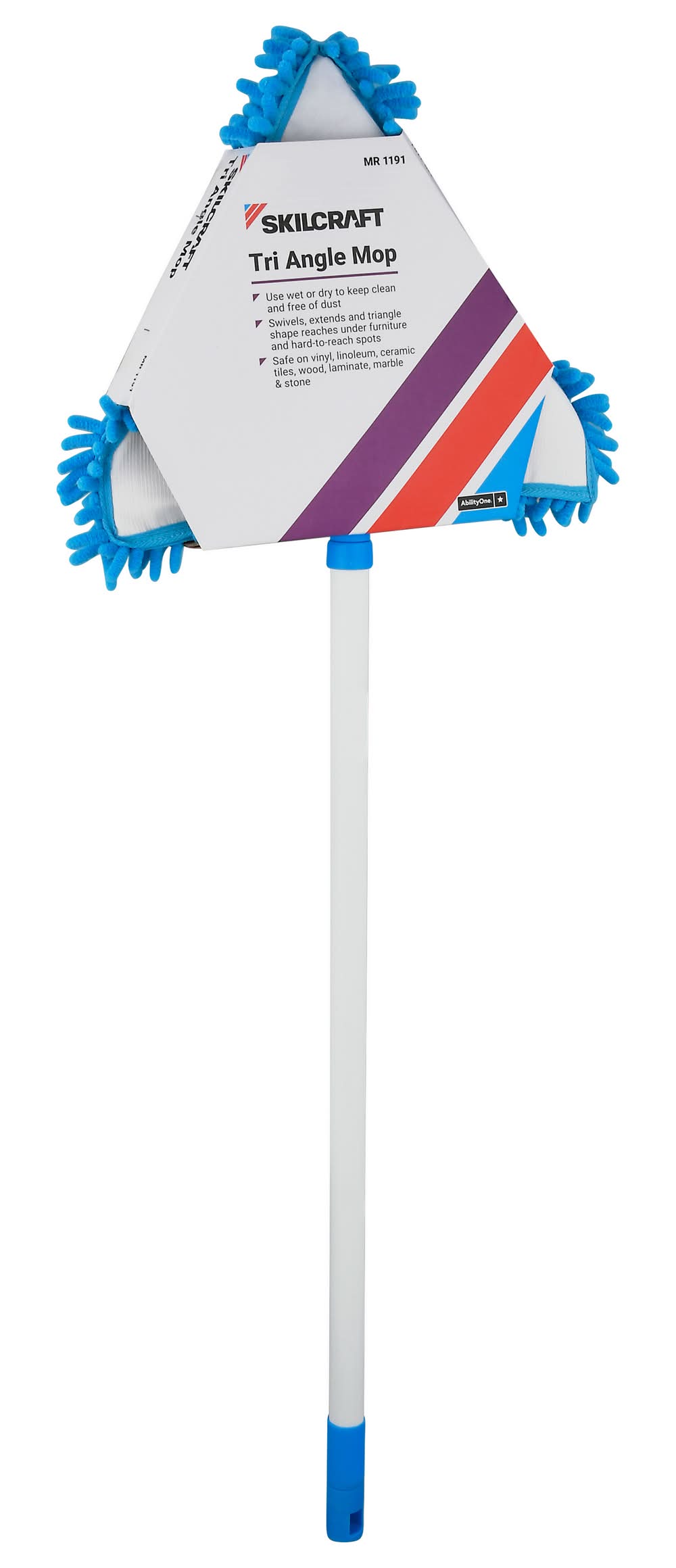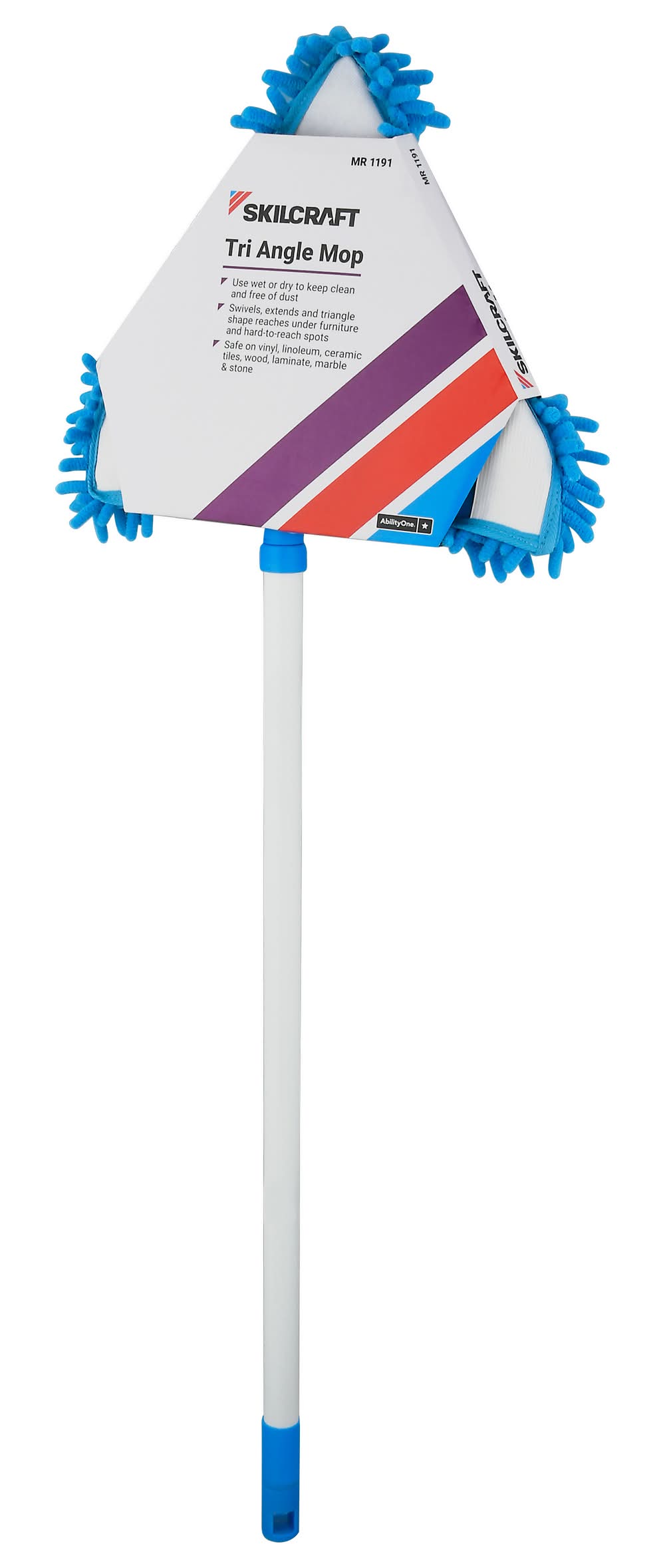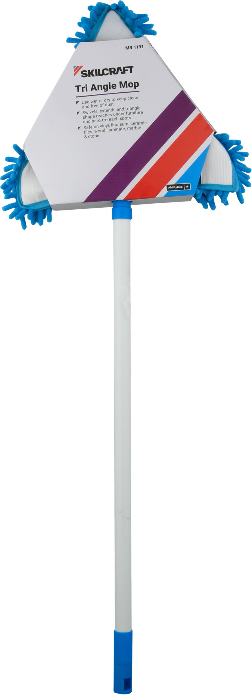 Use wet or dry to keep clean and free of dust. Swivels, extends and triangle shape reaches under furniture and hard-to-reach spots. Safe on vinyl, linoleum, ceramic tiles, wood, laminate, marble & stone. AbilityOne. This product includes extendable handle, mop head frame, and chenille cleaning pad. Components made in China. LCI,