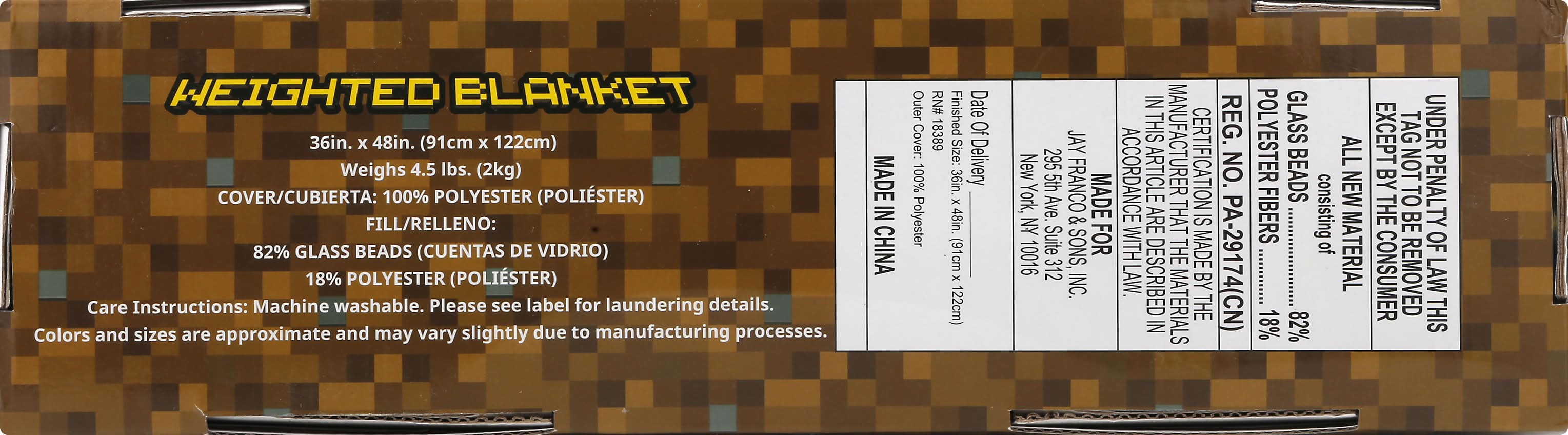 36 in x 48 in (91 cm x 122 cm). Weighs 4.5 lbs (2 kg). It is recommended that the weighted blanket should be no more than 10% of the child's weight. Colors and sizes are approximate and may vary slightly due to manufacturing processes. Comments 1-800-344-3022. Made in China. JAY FRANCO & SONS,