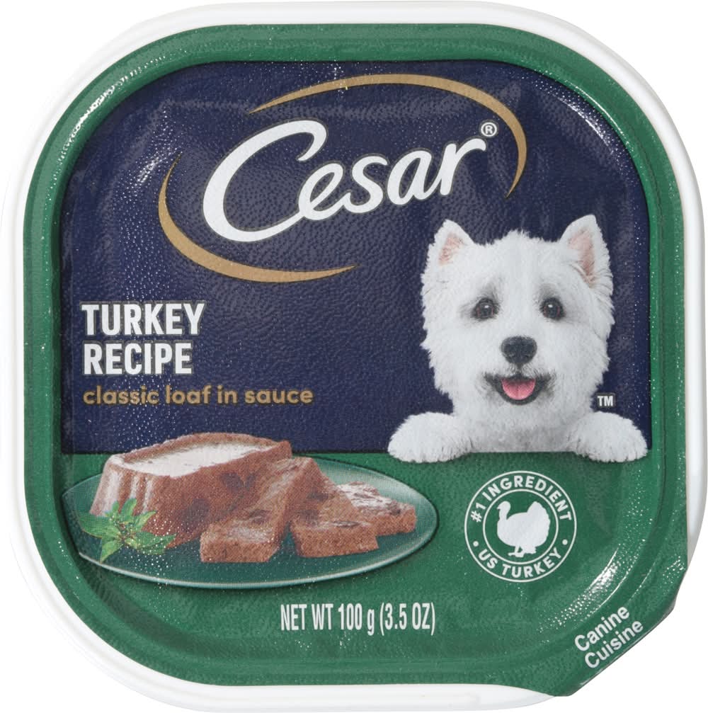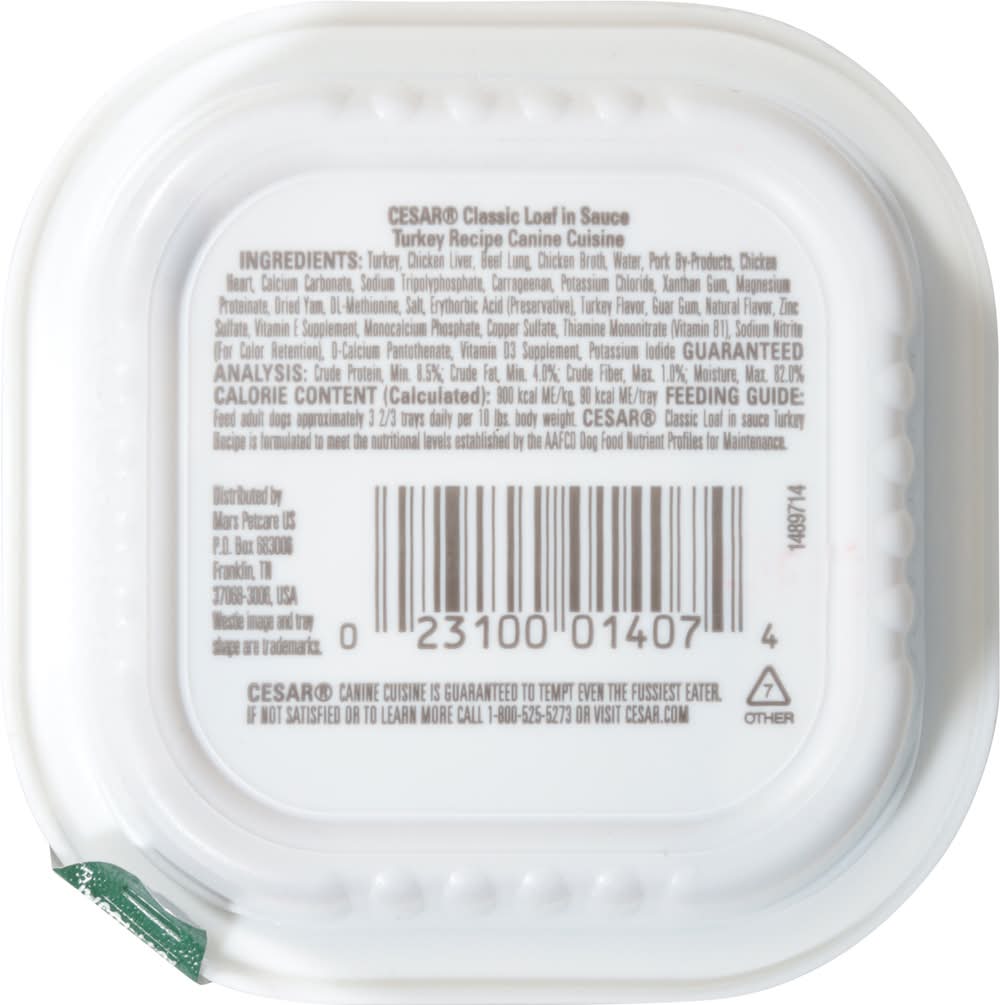 Cesar Canine Cuisine provides complete and balanced nutrition in a pate formulated just for adult dogs|Cesar Canine Cuisine is fortified with vitamins and minerals to help dogs of all sizes, especially small dogs, stay healthy|This savory, gourmet wet food for dogs is served in convenient trays with easy, peel-away freshness seals|Cesar Canine Cuisine Trays feature mouthwatering turkey flavor pate in meaty juices for dogs with refined tastes Approximately 85 Kcals Per 3.5 Oz (100G) Tray; Crude Protein (Min): 8%; Crude Fat (Min): 3.5%; Crude Fiber; (Max): 1%; Moisture (Max): 82%; Packaging: Reusable