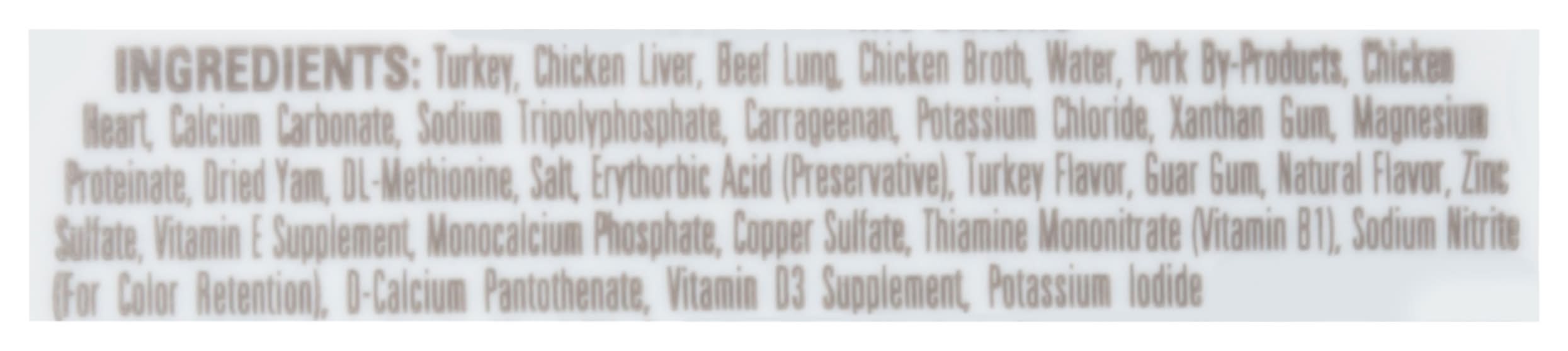 Ingredients: Turkey, Chicken Liver, Beef Lung, Chicken Broth, Water, Pork By-Products, Chicken Heart, Calcium Carbonate, Sodium Tripolyphosphate, Carrageenan, Potassium Chloride, Xanthan Gum, Magnesium Proteinate, Dried Yam, DL-Methionine, Salt, Erythorbic Acid (Preservative), Turkey Flavor, Guar Gum, Natural Flavor, Zine Sulfate, Vitamin E Supplement, Monocalcium Phosphate, Copper Sulfate, Thiamine Mononitrate (Vitamin B1), Sodium Nitrite (for Color Retention), D-Calcium Pantothenate, Vitamin D3 Supplement, Potassium Iodide