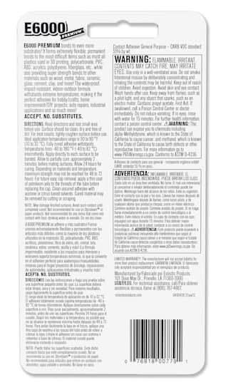 Find the E6000 Premium Contact Adhesive, 2oz. at Michaels. E6000 Premium bonds to even more substrates! It forms extremely flexible, permanent bonds to the most difficult items such as most all plastics used in 3D printing, polycarbonate, PVC, ABS, acrylics, polystyrene, etc... while also providing super strength bonds to other materials such as wood, metal, fabric, ceramic, glass, clay and more! Clear. 2 fl. oz. (59.1 mL). Permanent and super flexible. Waterproof and impact resistant. Washing machine and dryer safe. Indoor/outdoor formula - withstands extreme temps. E6000 Premium Contact Adhesive, 2oz. Color: Null