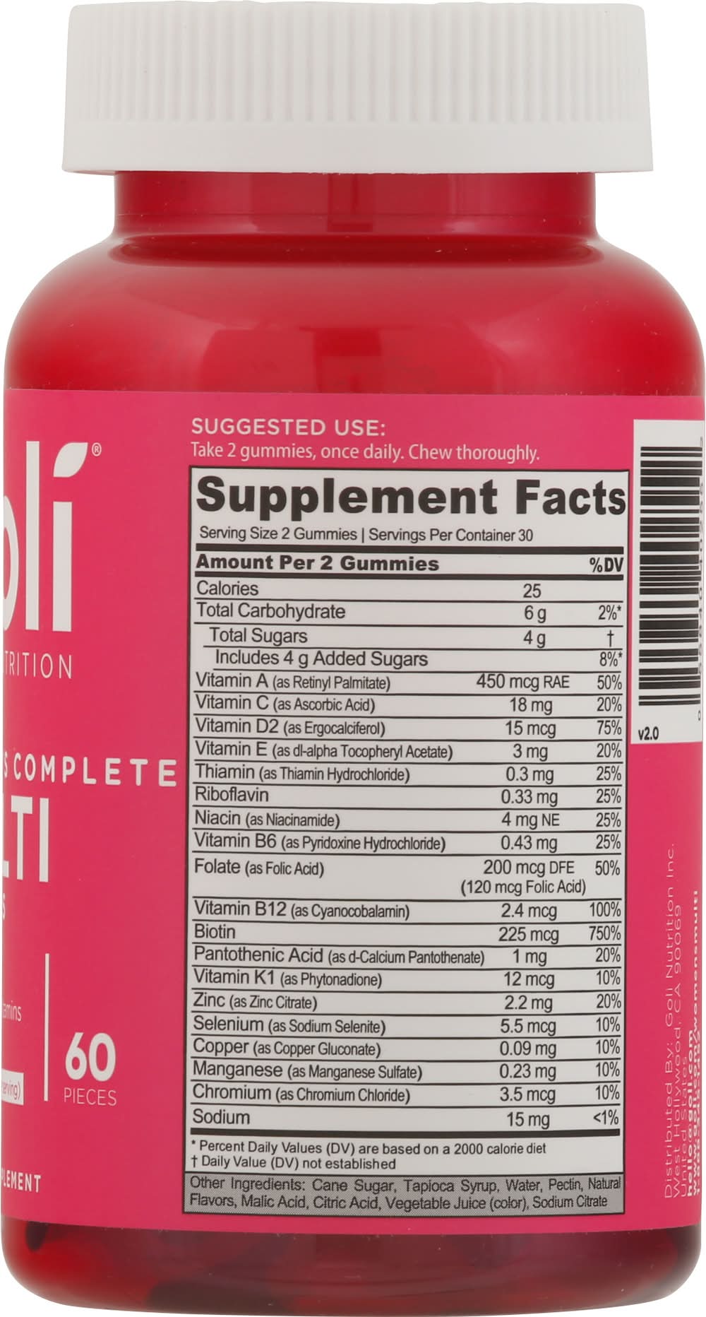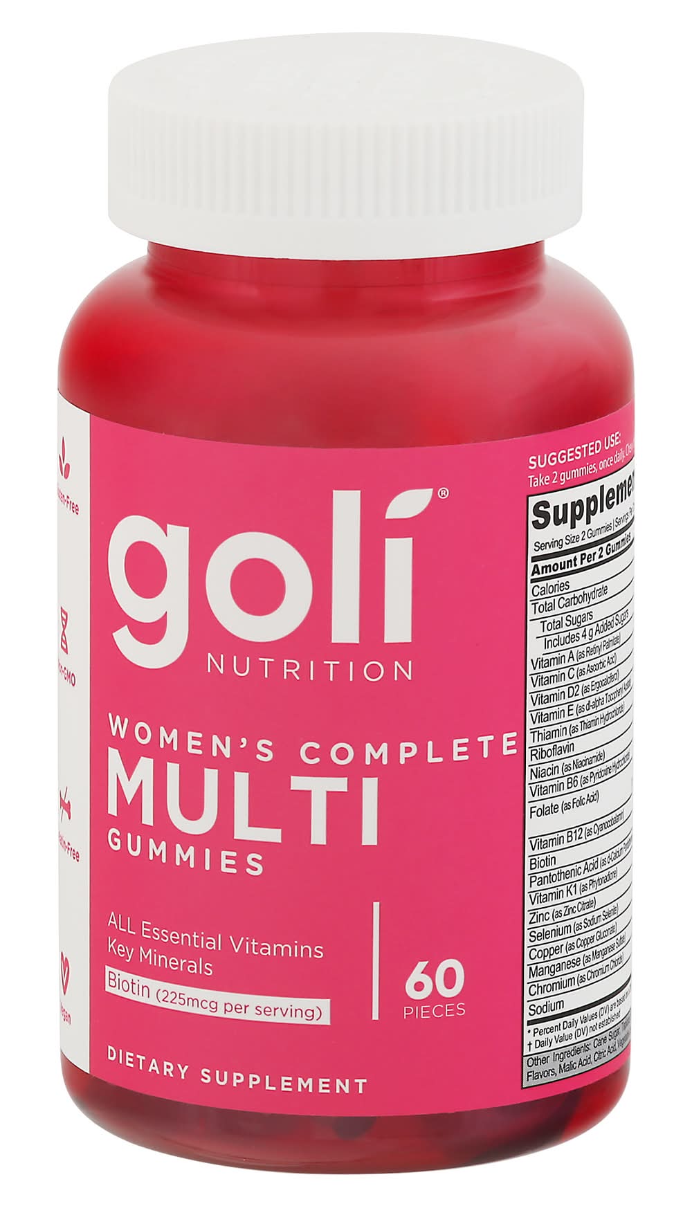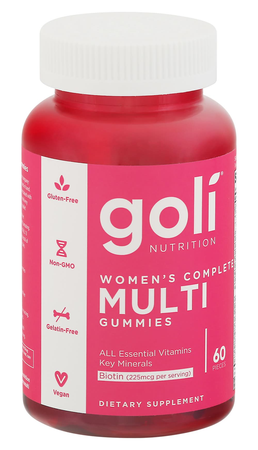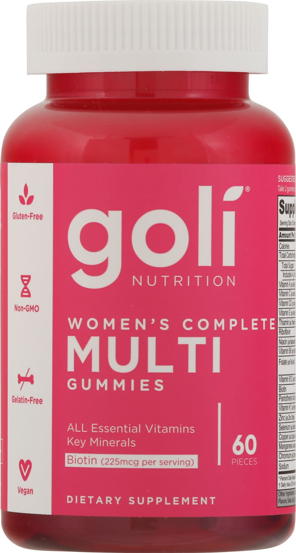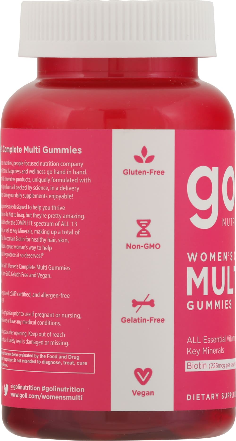 Dietary Supplement. Gluten-free. Vegan. Non-GMO. All essential vitamins, key minerals. Gelatin-free. Women's Complete Multi Gummies. Goli Nutrition is an inventive, people focused nutrition company driven by the belief that happiness and wellness go hand in hand. We strive to provide innovative products, uniquely formulated with complementary ingredients all backed by science, in a delivery format that makes taking your daily supplements enjoyable! These delicious gummies are designed to help you thrive like you were born to do! Not to brag, but they're pretty amazing. They're formulated to offer the Complete spectrum of all 13 Essential Vitamins, as well as Key Minerals, making up a total of 18 Nutrients! They also contain Biotin for healthy hair, skin, and nails - talk about a power woman's way to help give your body all the goodness it so deserves! We are proud that Goli Women's Complete Multi Gummies are Gluten-Free, Non-GMO, Gelatin Free and Vegan. Health Simple. Made in a FDA registered, CGMP certified, and allergen-free facility in the U.S.A. www.goli.com/womensmulti. Facebook. Instagram. Twitter. (at)golinutrition. (hashtag)golinutrition. (These statements have not been evaluated by the Food and Drug Administration. This product is not intended to diagnose, treat, cure, or prevent any disease.)