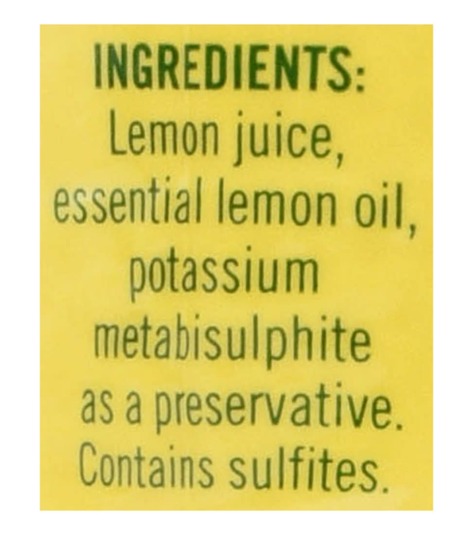 Lemon Juice, Essential Lemon Oil, Potassium Metabisulphite as a Preservative Contains: Sulfites