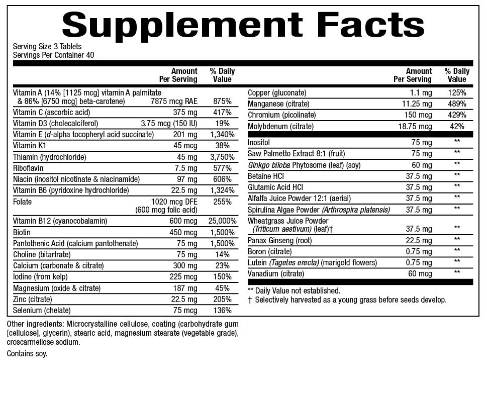 Other Ingredients: Microcrystalline Cellulose, Coating (Carbohydrate Gum [Cellulose], Glycerin), Steric Acid, Magnesium Stearate (Vegetable Grade), Croscarmellose Sodium). Contains: Contains no artificial colors, preservatives, or sweeteners; no dairy, sugar, gluten, yeast, egg, fish, shellfish, salt, tree nuts, or GMOs.