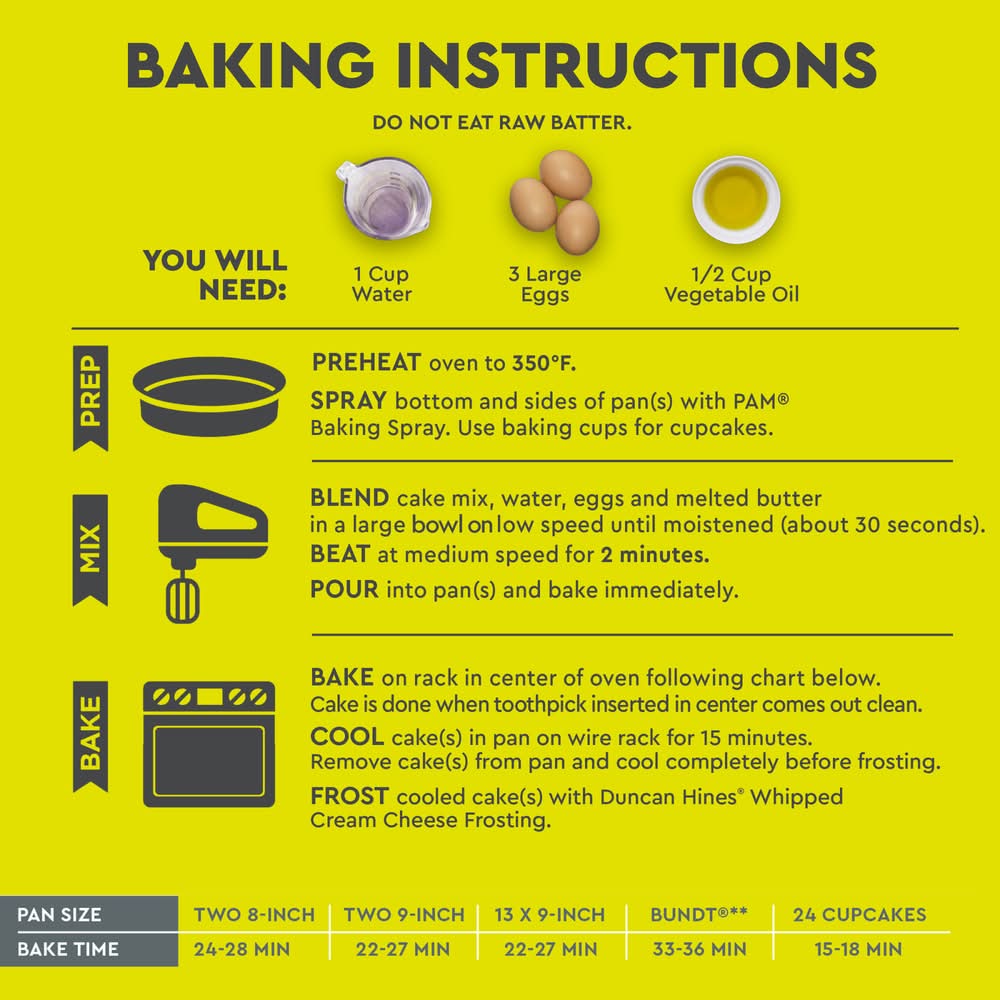 You will need: 1 cup water; 3 large eggs; 1/3 cup vegetable oil. do not eat raw batter. baking instructions: step (1) prep: preheat oven to 350 degrees f for metal and glass pan(s), 325 degrees f for dark or coated pan(s) (add 3-5 minutes to bake time for dark or coated pan(s). cake is done when toothpick inserted in center comes out clean). grease sides and bottom of pan(s) and flour lightly. use baking cups for cupcakes. step (2) mix: blend cake mix, water, oil and eggs in a large bowl at low speed until moistened (about 30 seconds). beat at medium speed for 2 minutes. pour batter in pan(s) and bake immediately. step (3) bake: bake in center of oven following chart below. cool cake(s) in pan on wire rack for 15 minutes. remove cake(s) from pan and cool completely before frosting. lower fat recipe: prepare and bake following the directions above except using 3/4 cup water, 1/3 cup unsweetened applesauce and 3 eggs. high altitude (over 3,500 ft): preheat oven to 350 degrees f. stir 2 tablespoons of flour into cake mix, add 1/3 cup oil, 1 cup water, and 3 eggs. blend as directed in step 2. bake at 350 degrees f. two 8-ich pans 23-28 min; 13 x 9-inch pan baked 21-24 min; 24 cupcakes 16-20 min. pan size: two 8-inch; 23-28 min bake time; pan size: two 9-inch; 22-27 min bake time; pan size: 13 x 9-inch; bake time: 22-27 min; pan size: bundt (bundt is a registered trademark of northland aluminum products, inc, minneapolis, minnesota) bake time: 33-36 min; pan size: 24 cupcakes; 15-18 min.