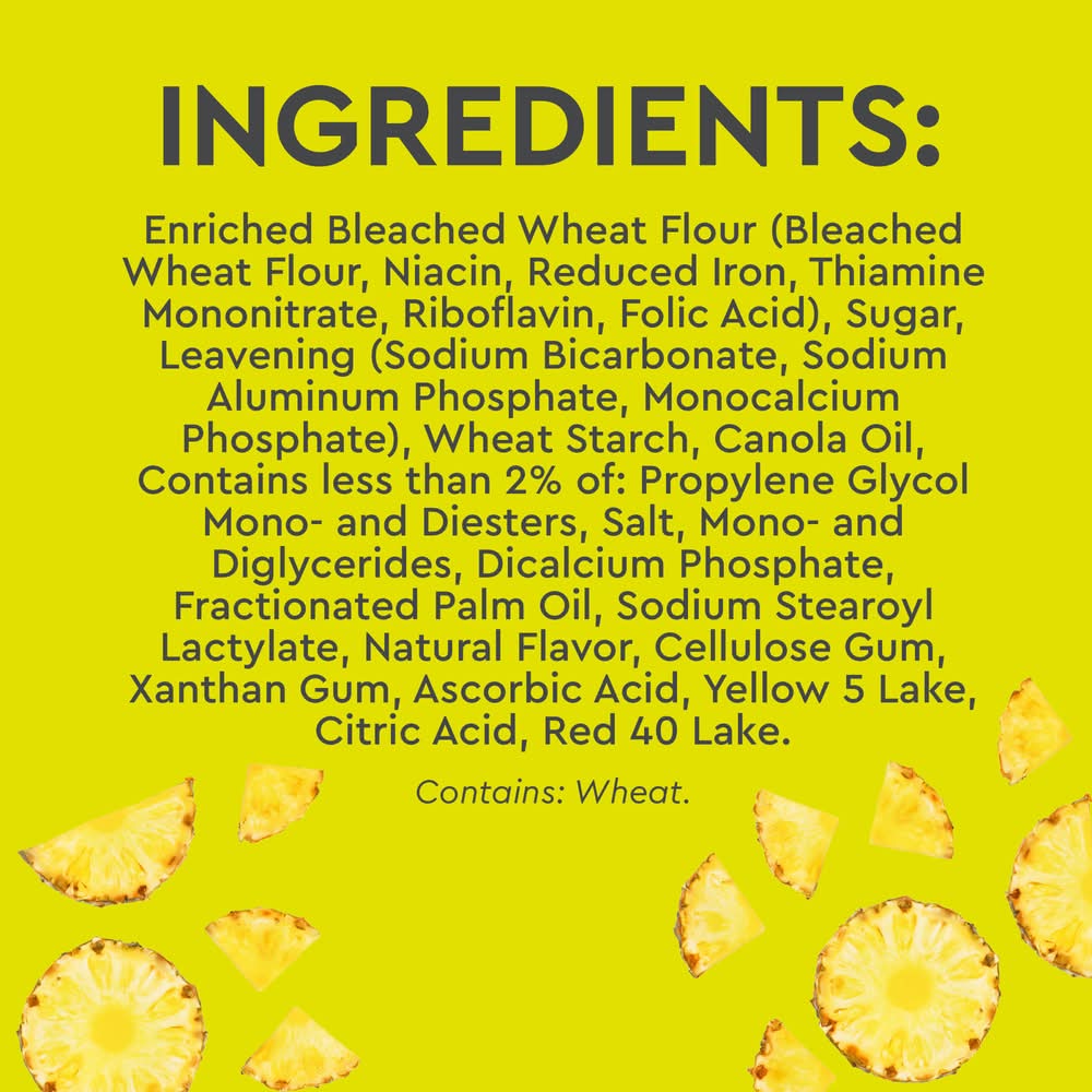 Ingredients: INGREDIENTS: SUGAR, ENRICHED BLEACHED WHEAT FLOUR (WHEAT FLOUR, NIACIN, REDUCED IRON, THIAMINE MONONITRATE, RIBOFLAVIN, FOLIC ACID), EMULSIFIED PALM SHORTENING (PALM OIL, PROPYLENE GLYCOL MONO- AND DIESTERS OF FATS AND FATTY ACIDS, MONO- AND DIGLYCERIDES, SODIUM STEAROYL LACTYLATE), LEAVENING (SODIUM BICARBONATE, SODIUM ALUMINUM PHOSPHATE, DICALCIUM PHOSPHATE, MONOCALCIUM PHOSPHATE MONOHYDRATE), WHEAT STARCH, CONTAINS 2% OR LESS OF: SALT, CORN SYRUP SOLIDS, PINEAPPLE JUICE SOLIDS, PALM OIL, CELLULOSE GUM, XANTHAN GUM, NATURAL FLAVOR, YELLOW 5 LAKE, CITRIC ACID, RED 40 LAKE. Contains: Wheat