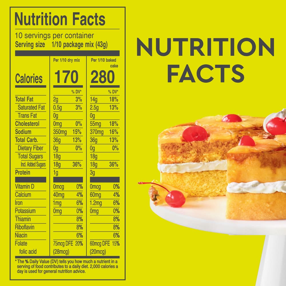 Duncan Hines Signature Perfectly Moist Pineapple Supreme Naturally Flavored Cake Mix makes a moist and delicious pineapple cake that is sure to become a family favorite. The smooth and velvety cake batter makes it easy to bake a perfectly moist cake every time. Simply add water, eggs and vegetable oil to the baking mix and stir to combine. Pour into a pan and bake for the recommended time in the instructions. Prepare this pineapple cake mix to make a decadent layer cake with frosting or add pineapple slices and cherries for pineapple upside down cake. You can also use it as a cupcake mix, or to make fun cake creations like cake pops. This certified Kosher boxed cake mix makes one 8 or 9 inch layer cake, one 13 x 9 inch sheet cake or 24 cupcakes. From birthday cake to single serve desserts, Duncan Hines has you covered when you're ready to bake and create. Bake someone happy! • Conagra brands, PO Box 3534,Chicago,IL,60654,800-362-9834 • Packaging: Reusable
