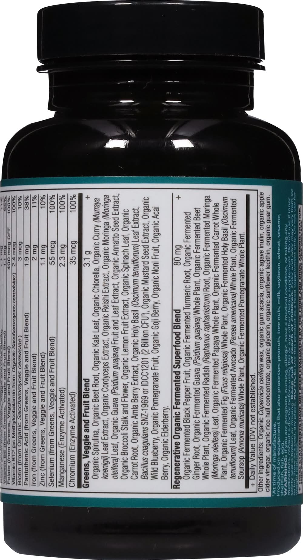 Greens, Veggie and Fruit Blend: Organic Spirulina, Organic Beet Root, Organic Kale Leaf, Organic Chlorella, Organic Curry (Murraya Koenigii) Leaf Extract, Organic Cordyceps Extract, Organic Reishi Extract, Organic Moringa (Moringa Oleifera) Leaf, Organic Guava (Psidium Guajava) Fruit and Leaf Extract, Organic Annatto Seed Extract, Organic Broccoli Stalk and Flower, Organic Lemon Fruit Extract, Organic Spinach Leaf, Organic Carrot Root, Organic Amla Berry Extract, Organic Holy Basil (Oscimum Tenuiflorum) Leaf Extract, Bacillus Coagulans Snz-1969 or Ifcc1201 (2 Billion CFU (1)), Organic Mustard Seed Extract, Organic Wild Blueberry, Organic Pomegranate Fruit, Organic Goji Berry, Organic Noni Fruit, Organic Acai Berry, Organic Elderberry, Regenerative Organic Fermented Superfood Blend: Organic Fermented Black Pepper Fruit, Organic Fermented Turmeric Root, Organic Fermented Ginger Root, Organic Fermented Guava (Psidium Guajava) Whole Plant, Organic Fermented Beet Whole Plant, Organic Fermented Radish (Raphanus Raphanistrum) Root, Organic Fermented Moringa (Moringa Oleifera) Leaf, Organic Fermented Papaya Whole Plant, Organic Fermented Carrot Whole Plant, Organic Fermented Fig (Ficus Religiosa) Whole Plant, Organic Fermented Holy Basil (Oscimum Tenuiflorum) Leaf, Organic Fermented Avocado (Persea Americana) Whole Plant, Organic Fermented Soursop (Annona Muricata) Whole Plant, Organic Fermented Pomegranate Whole Plant. Other Ingredients: Organic Copernicia Cerifera Wax, Organic Gum Acacia, Organic Agave Inulin, Organic Apple Cider Vinegar, Organic Rice Hull Concentrate, Organic Glycerin, Organic Sunflower Lecithin, Organic Guar Gum, (1) at Time of Manufacture Contains: Mustard, Peanuts, Tree Nuts, Milk, Soybeans, Wheat, Sesame, Crustacean Shellfish, Fish, Eggs, Molluscan Shellfish