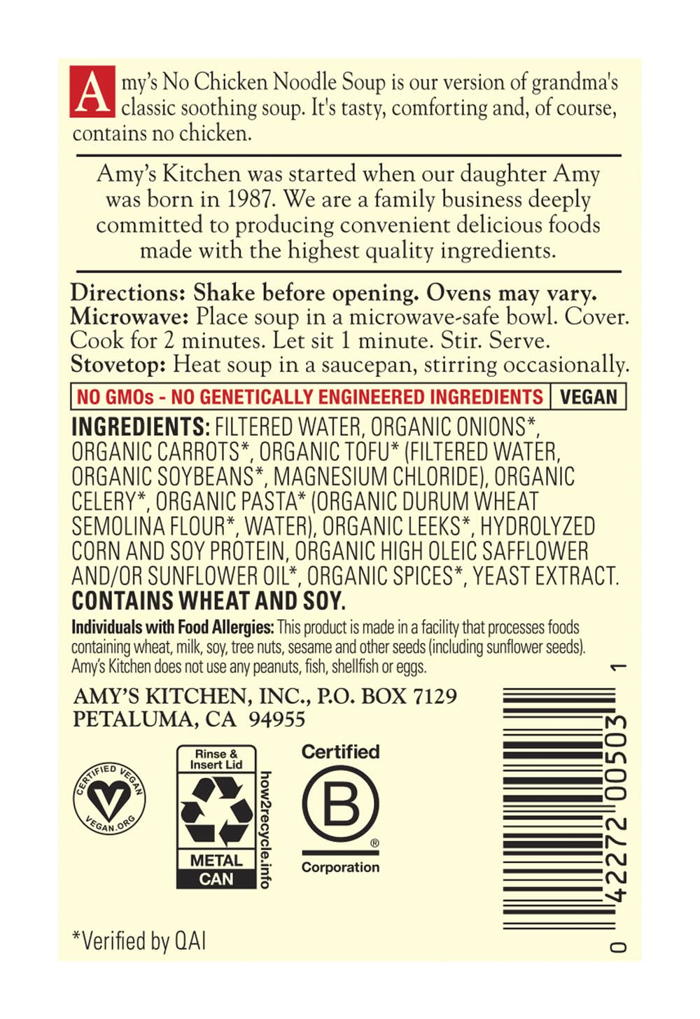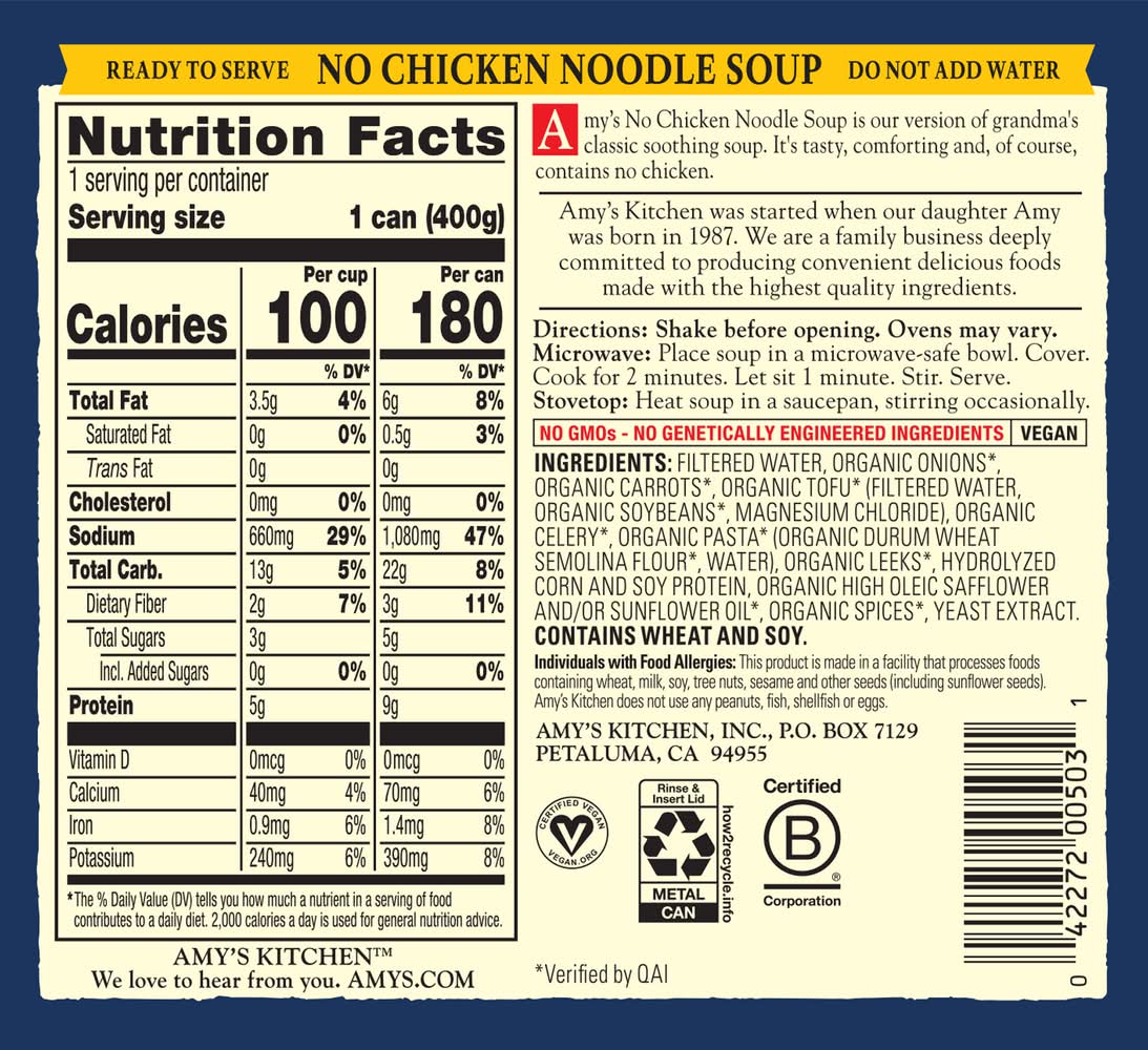 No Chicken Noodle Soup • Amy's Kitchen, Inc., PO Box 7129,Petaluma,CA,94955 • Packaging: Reusable