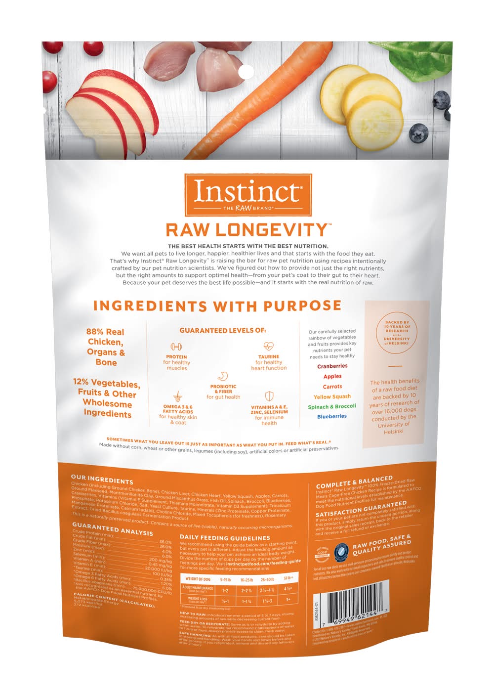 Chicken (including Ground Chicken Bone), Chicken Liver, Chicken Heart, Yellow Squash, Apples, Carrots, Ground Flaxseed, Montmorillonite Clay, Ground Miscanthus Grass, Fish Oil, Spinach, Broccoli, Blueberries, Cranberries, Vitamins (Vitamin E Supplement, Thiamine Mononitrate, Vitamin D3 Supplement), Tricalcium Phosphate, Potassium Chloride, Salt, Yeast Culture, Taurine, Minerals (Zinc Proteinate, Copper Proteinate, Manganese Proteinate, Calcium Iodate), Choline Chloride, Mixed Tocopherols (for freshness), Rosemary Extract, Dried Bacillus coagulans Fermentation Product.