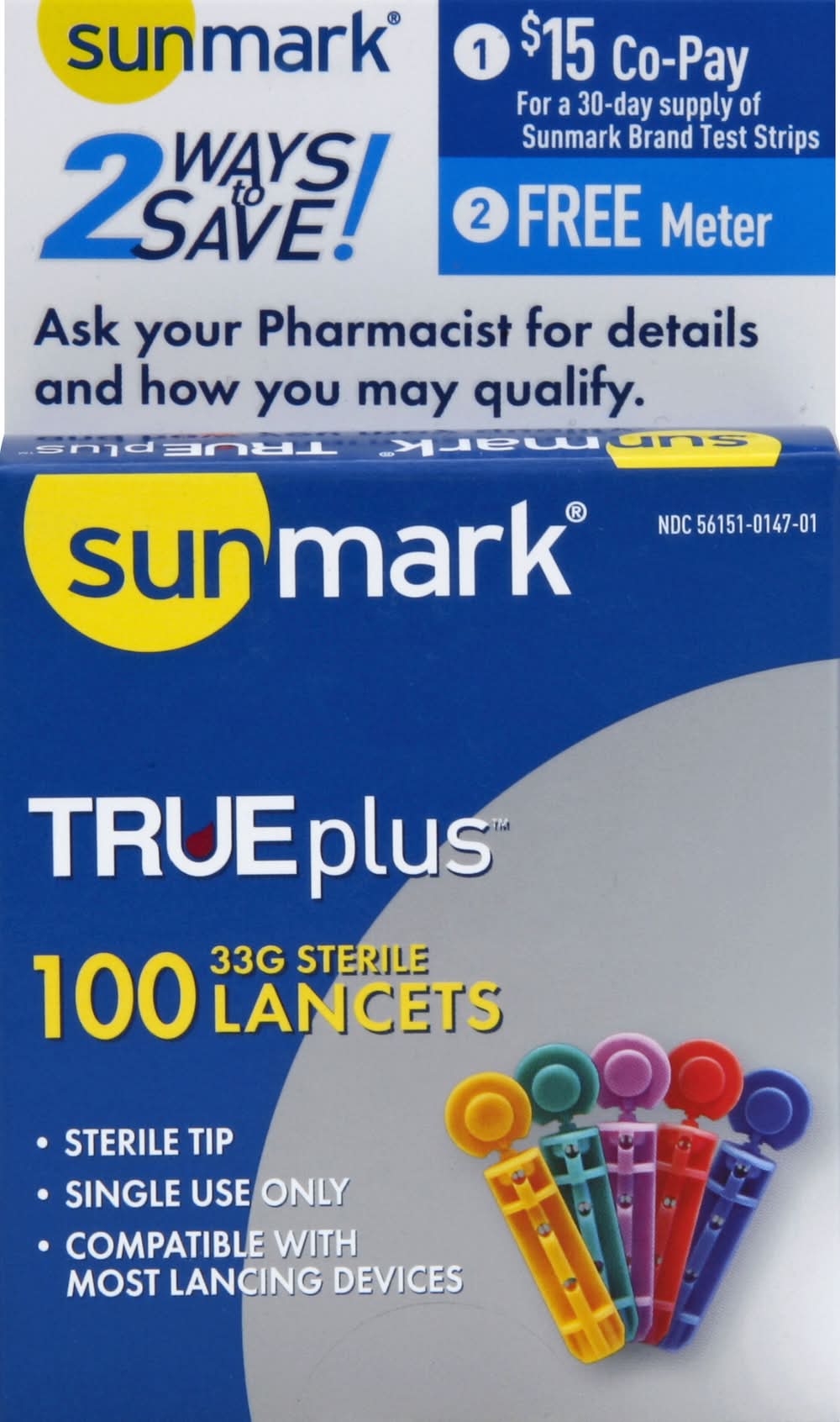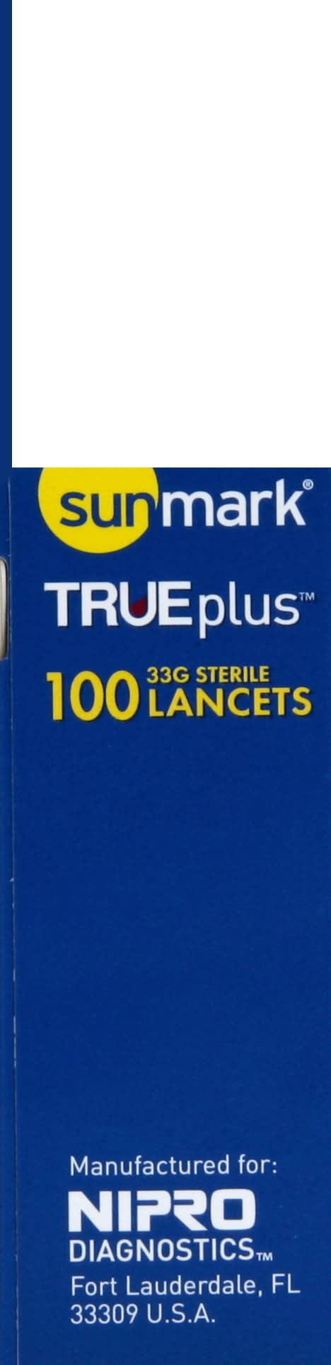 Sterile tip. Single use only. Compatible with most lancing devices. Fits most lancing devices. 2 ways to save! Ask your Pharmacist for details and how you may qualify. 1 $15 co-pay for a 30-day supply for Sunmark brand Test Strips. 2 free meter. Money back guarantee. www.sunmarkbrand.com. NIPRO DIAGNOSTICS,