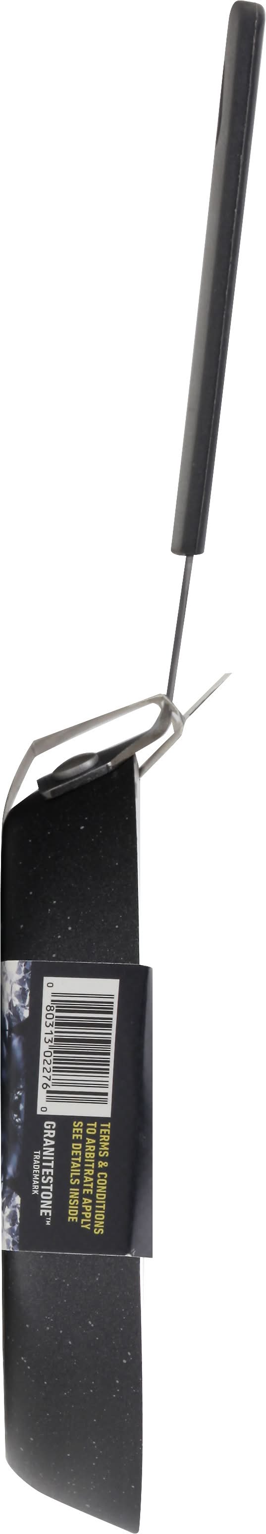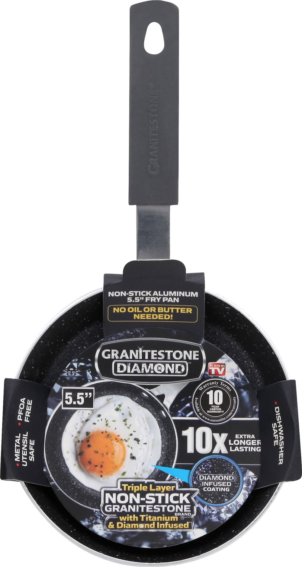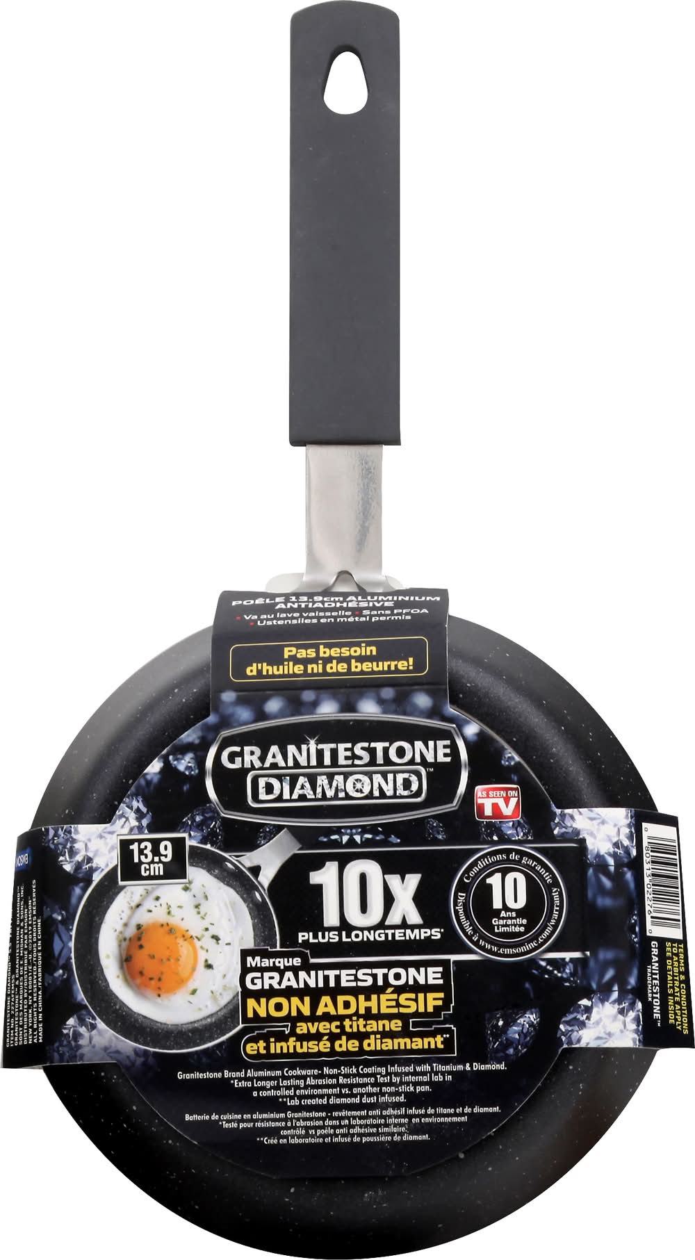 13.9 cm. No oil or butter needed! As seen on TV. 10x extra longer lasting (Extra longer lasting abrasion resistance test by internal lab in a controlled environment vs. Another non-stick pan). Dishwasher safe. Diamond infused coating. Triple layer non-stick Granitestone with titanium & diamond infused (Lab created diamond dust infused). Metal utensil safe. PFOA free. Granitestone brand aluminum cookware non-stick coating infused with titanium & diamond. Terms & conditions to arbitrate apply see details inside. www.emsoninc.com/warranty. Made in China. Emson,