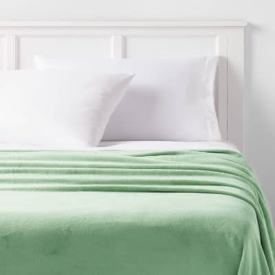 Made from a soft, lightweight fabric, this plush bed blanket helps keep you warm and cozy while feeling oh-so-soft to snuggle. In a solid color, this bed blanket easily blends with a range of decor styles and color palettes — just add coordinating bedding and pillows to create a colorful bedroom setting. • Color: Sage green • Size: Full-Queen