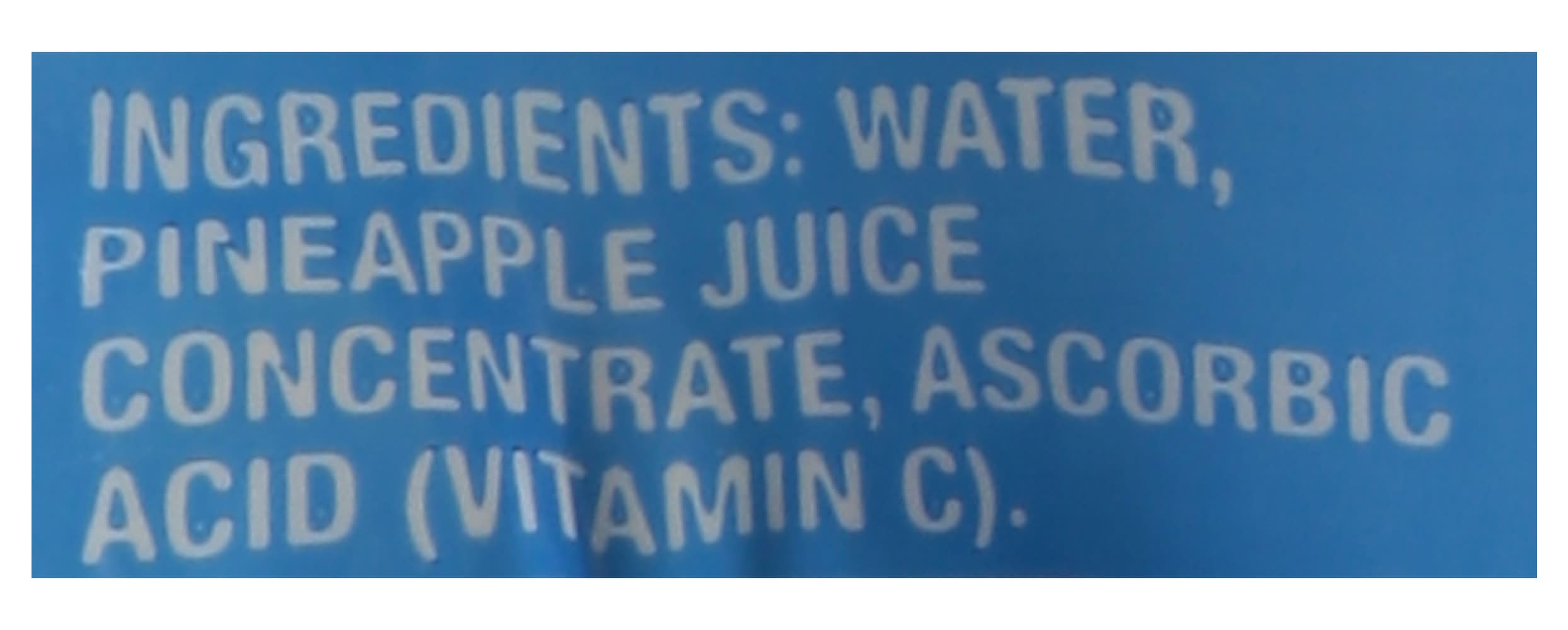 Ingredients: Water, Pineapple Juice Concentrate, Ascorbic Acid (Vitamin C) Contains: 'Free From Gluten', 'Free From Lactose'