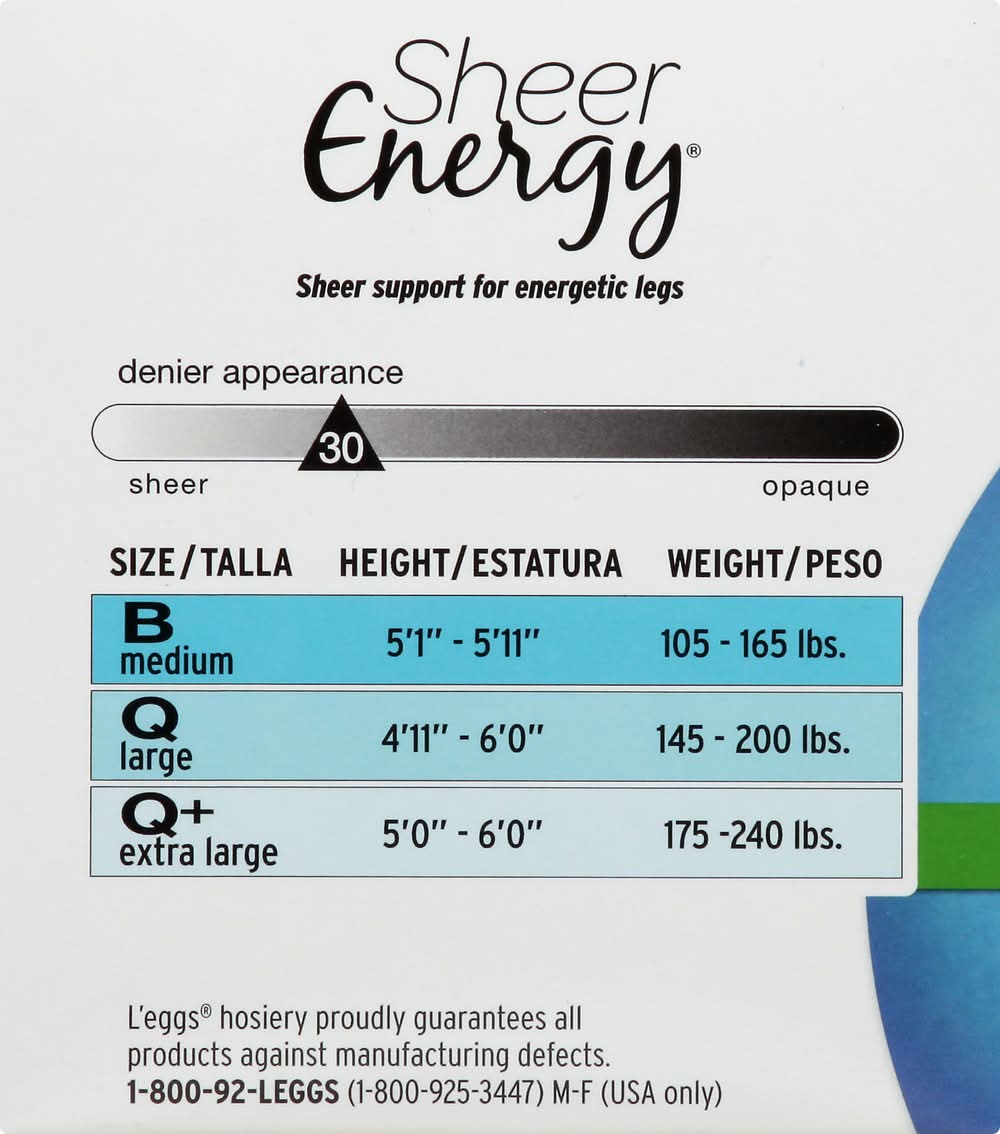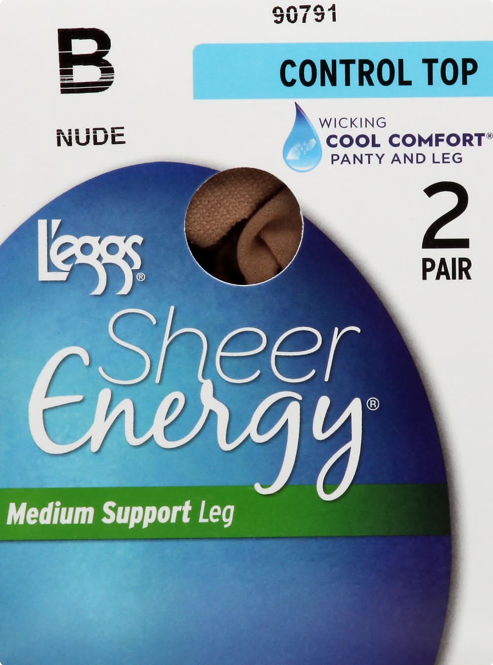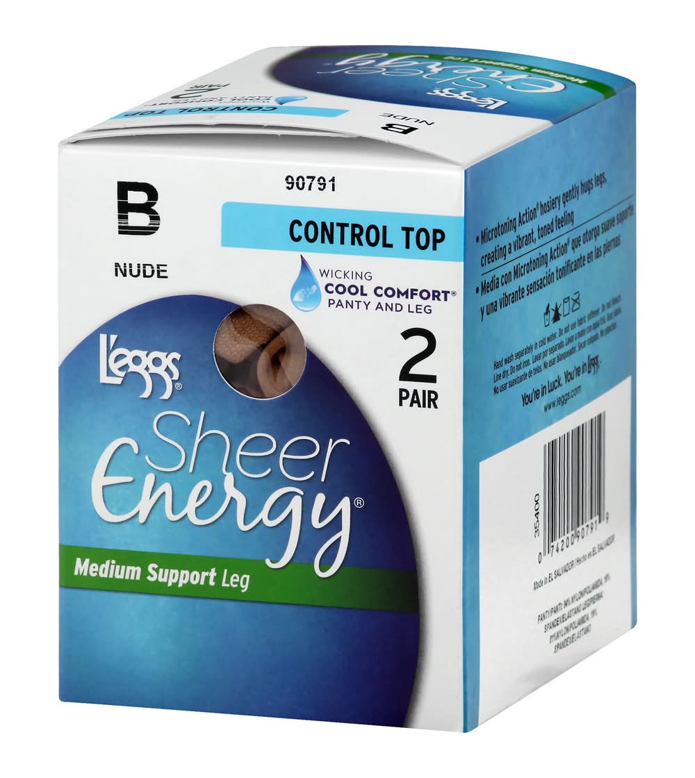 Wicking Cool Comfort panty and leg. Control top panty. Wicking Cool Comfort from waist to toe. Sheer toe. Sheer support for energetic legs. Denier Appearance: 30. Size: B medium; 5 feet 1 inch - 5 feet 11 inches; 105 - 165 lbs weight. Microtoning Action hosiery gently hugs legs, creating a vibrant, toned feeling. You're in luck. You're in L'eggs. Contents: 2 pair. L'eggs hosiery proudly guarantees all products against manufacturing defects. www.leggs.com. 1-800-92Leggs (1-800-925-3447) M-F (USA only). This package, excluding the window film, is recyclable in the US. Made in El Salvador. • Hanesbrands Inc, • Packaging: Reusable