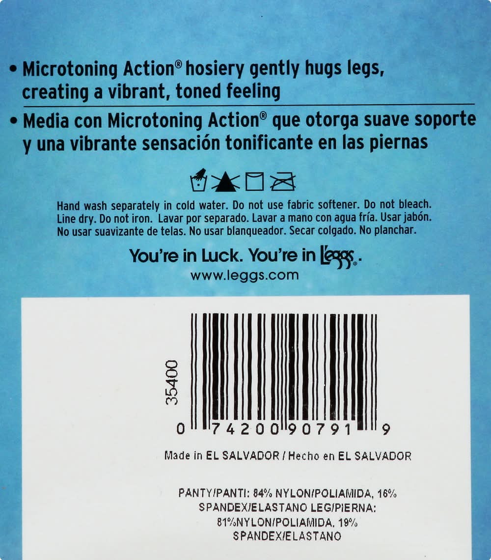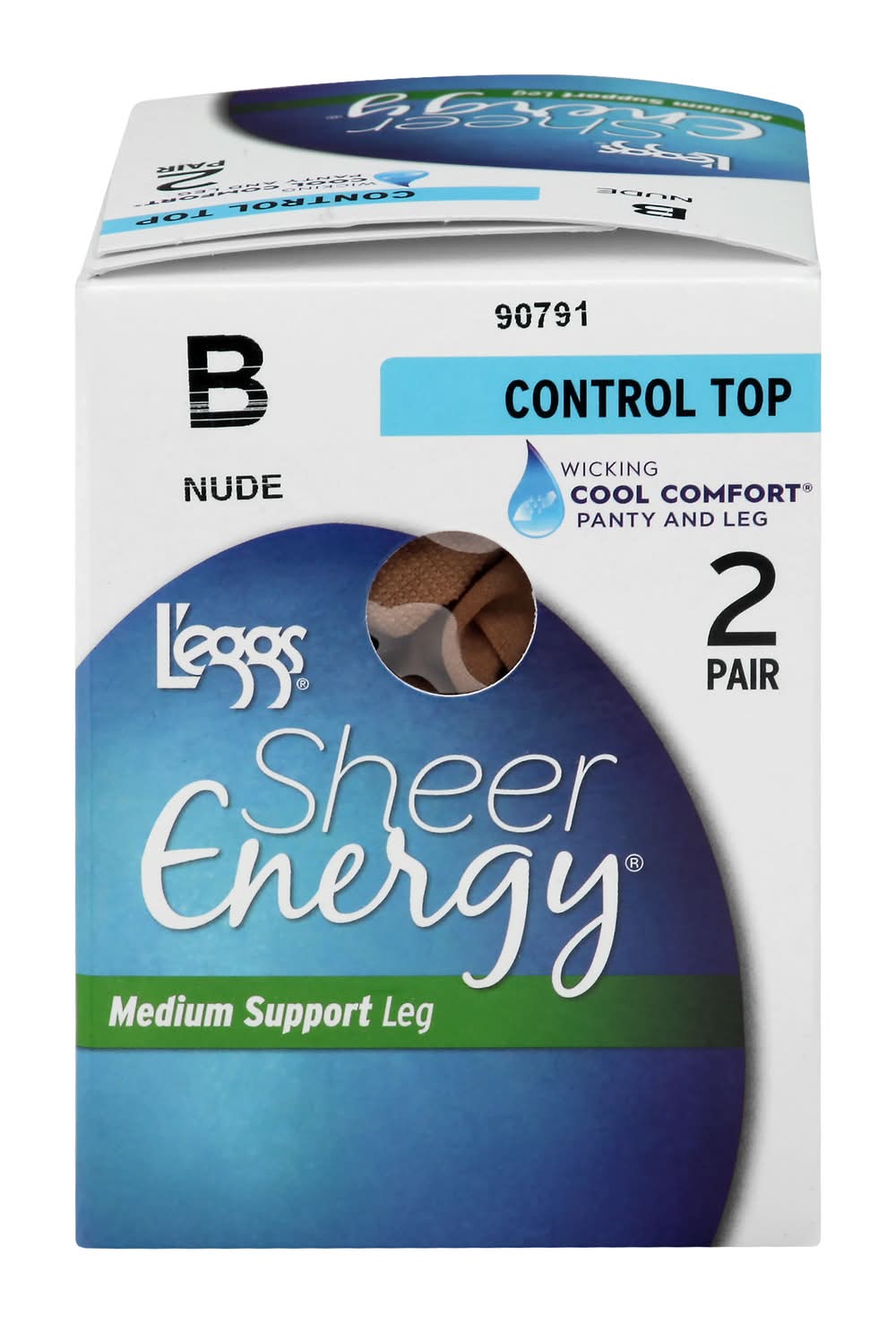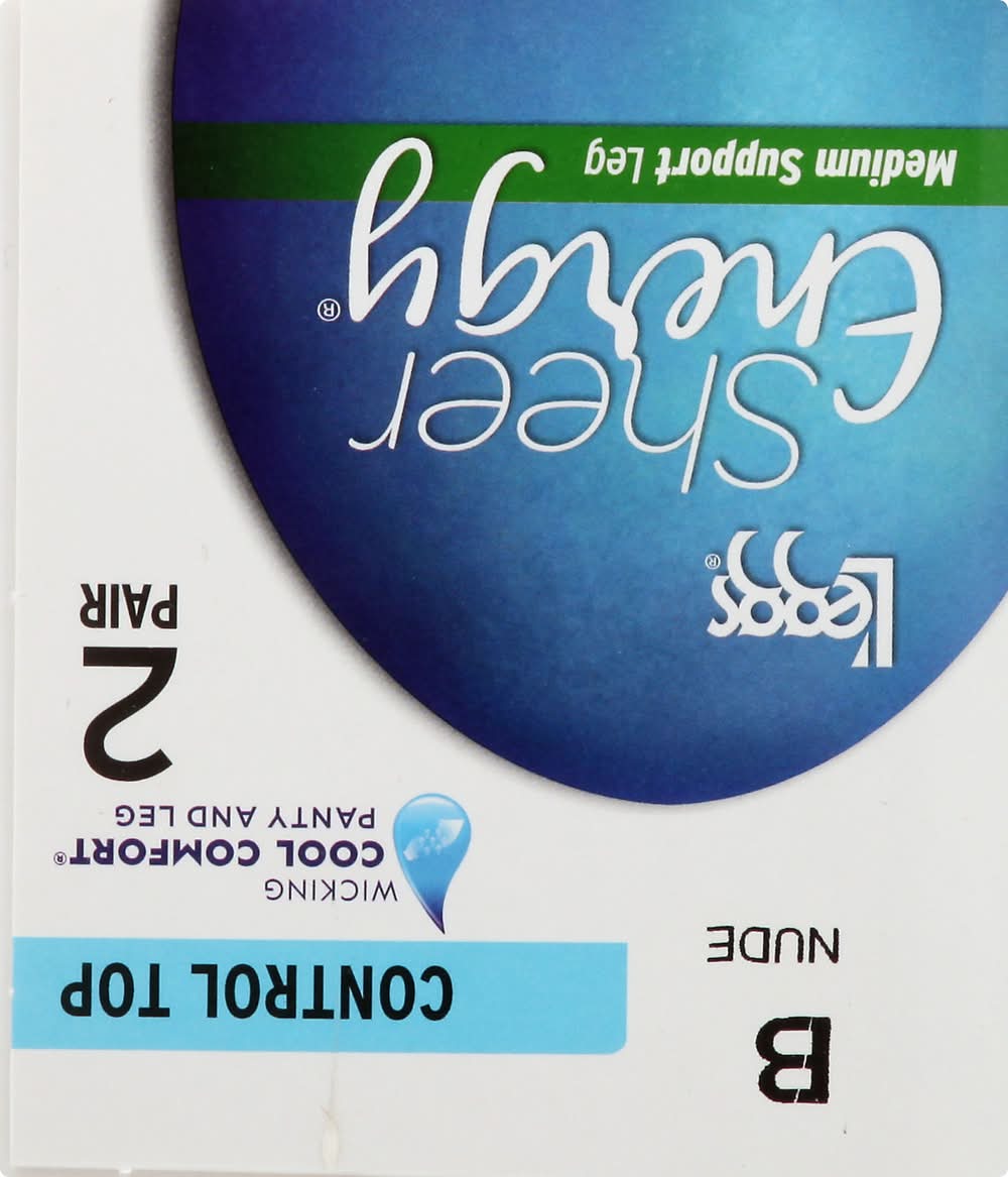 Wicking Cool Comfort panty and leg. Control top panty. Wicking Cool Comfort from waist to toe. Sheer toe. Sheer support for energetic legs. Denier Appearance: 30. Size: B medium; 5 feet 1 inch - 5 feet 11 inches; 105 - 165 lbs weight. Microtoning Action hosiery gently hugs legs, creating a vibrant, toned feeling. You're in luck. You're in L'eggs. Contents: 2 pair. L'eggs hosiery proudly guarantees all products against manufacturing defects. www.leggs.com. 1-800-92Leggs (1-800-925-3447) M-F (USA only). This package, excluding the window film, is recyclable in the US. Made in El Salvador. • Hanesbrands Inc, • Packaging: Reusable