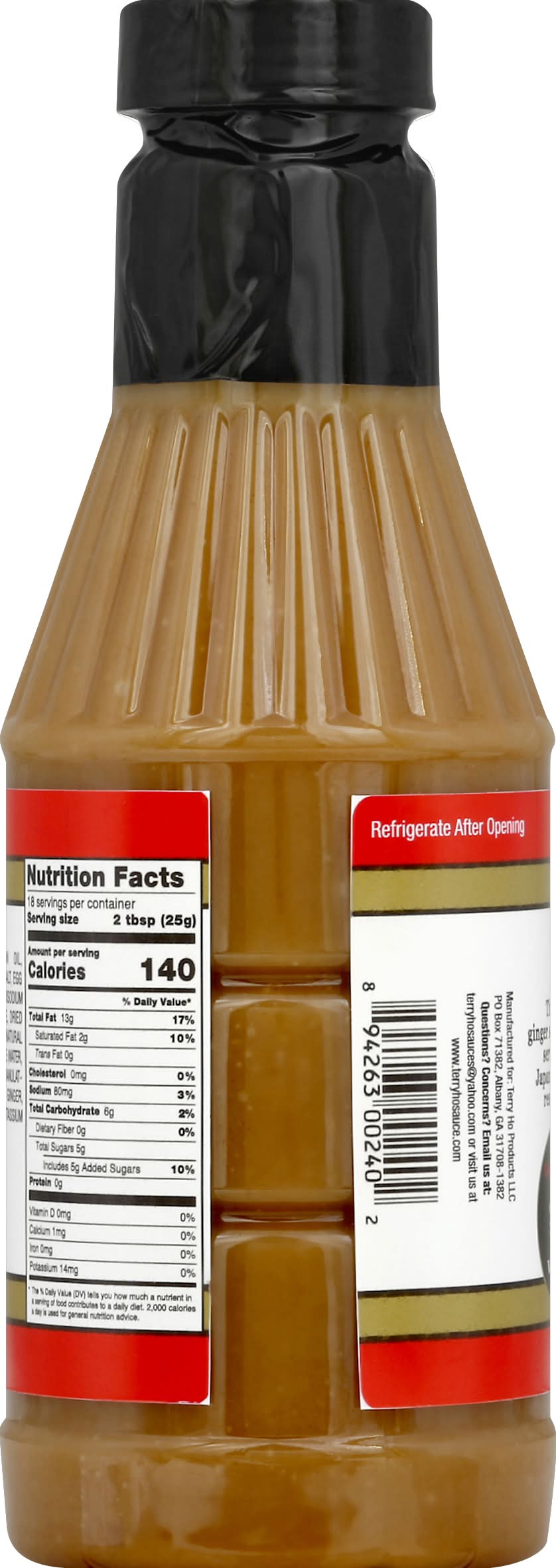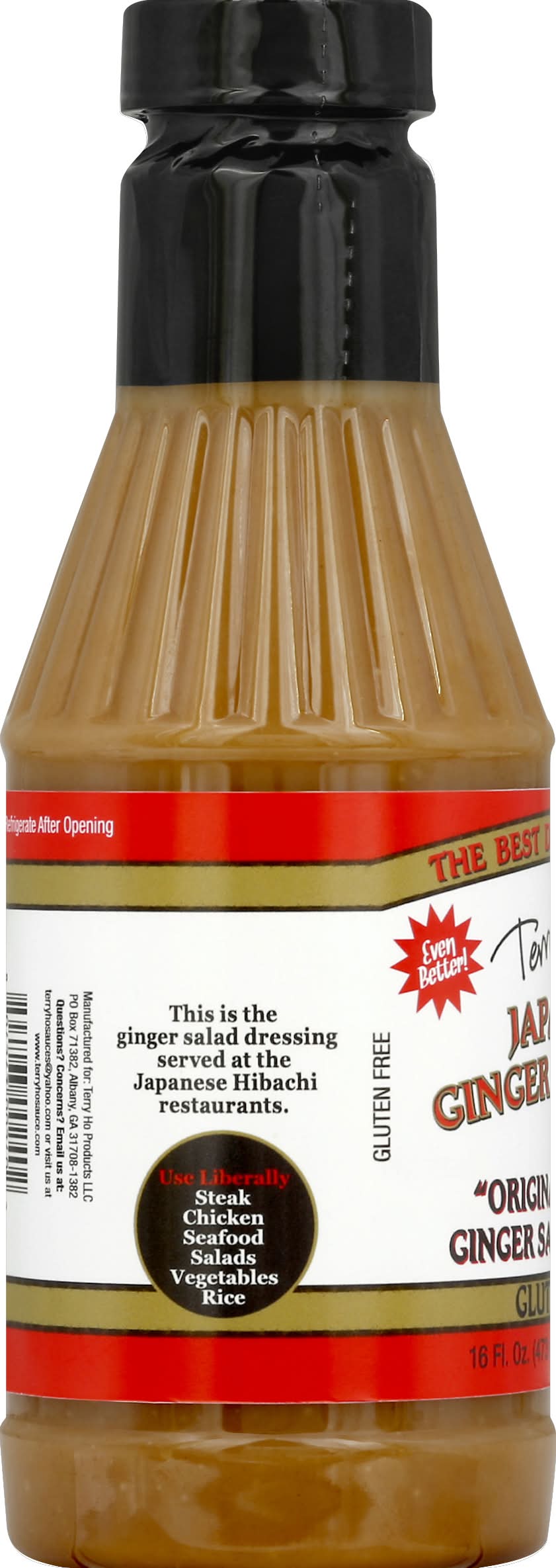 The original Japanese ginger salad dressing. Gluten free. The best dressing ever. Even better! This is the ginger salad dressing served at the Japanese Hibachi Restaurants. Use Liberally: steak; chicken; seafood; salads; vegetables; rice. Questions? Concerns? Visit us at www.terryhosauce.com. Terry Ho Products, PO Box 71382 Albany, GA 31708-1382