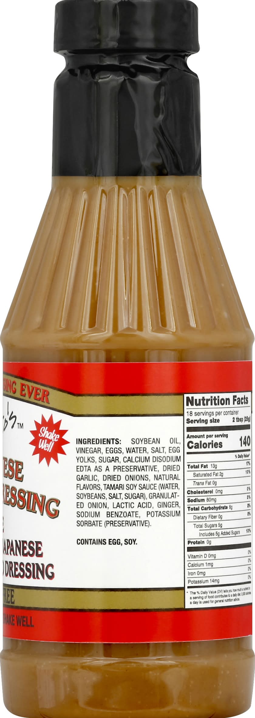 Soybean Oil, Vinegar, Eggs, Water, Salt, Egg Yolks, Sugar, Calcium Disodium EDTA as a Preservative, Dried Garlic, Dried Onions, Natural Flavors, Tamari Soy Sauce (Water Soybeans Salt Sugar), Granulated Onion, Lactic Acid, Ginger Sodium Benzoate, Potassium Sorbate (Preservative) Contains: Eggs, Soybeans