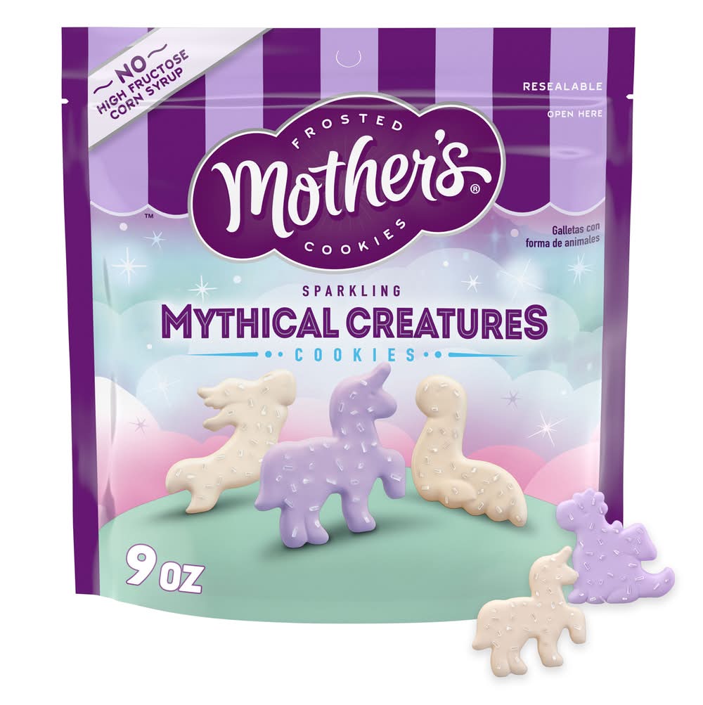 Spark imagination with every tasty creation! Stop and taste the frosting with Mother's Sparkling Mythical Creatures Cookies and unleash a mystical menagerie of creature-shaped snacks. Each of these bite-size shortbread cookies is fully frosted purple and white and topped with silver sugar sprinkles. The whimsical creature shapes take you on a mythical adventure with every delicious bite. The convenient resealable bag keeps these crunchy cookie snacks fresh, ready for everyday snacking, lunchbox packing or to use as a magical dessert topping. Grab one and fill snack time with fun, frosted fairy tales Ferrara Candy Company, Chicago,IL,60607