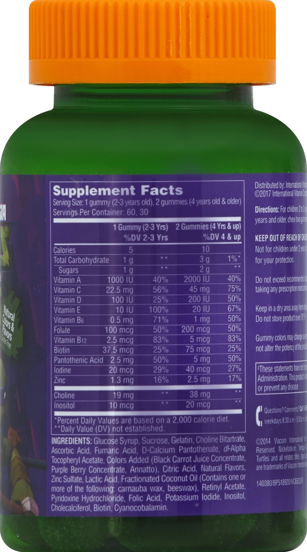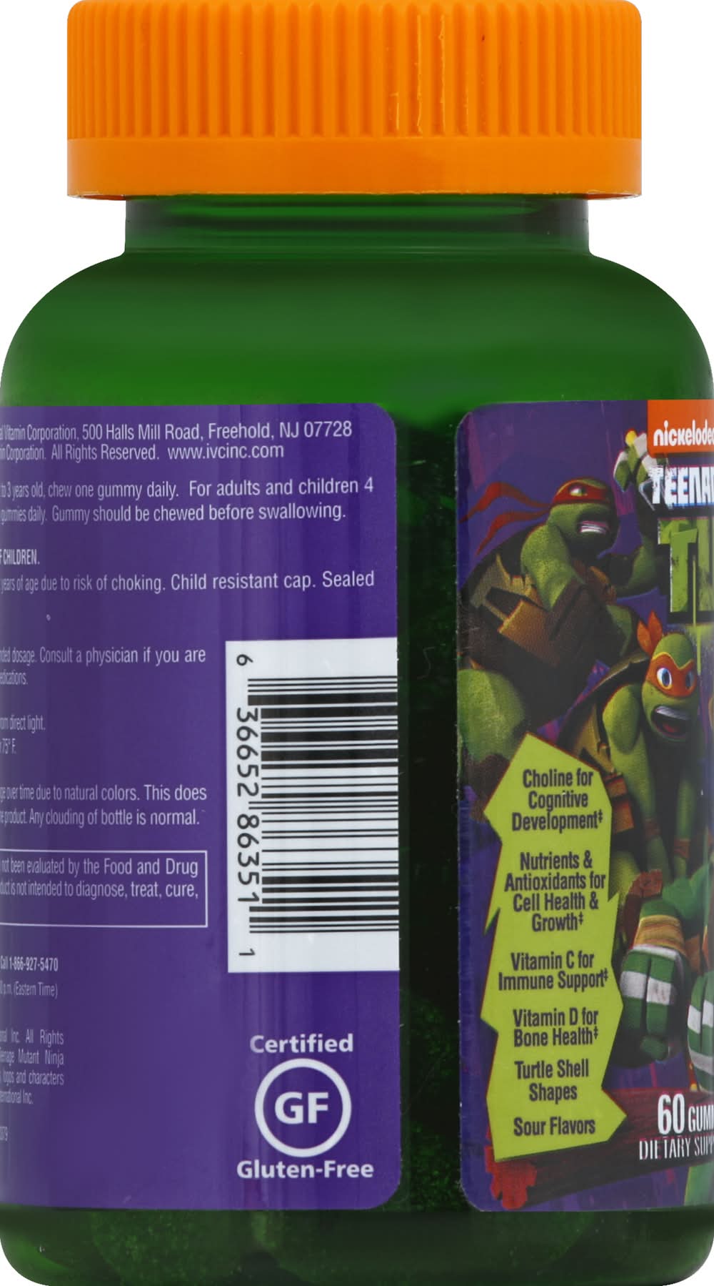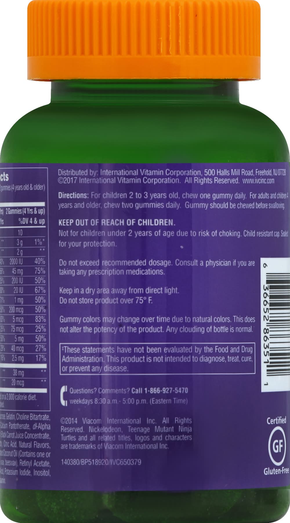 Dietary Supplement. Natural colors & flavors. Gluten free Certified gluten-free. Choline for cognitive development. Nutrients & antioxidants for cell health & growth. Vitamin C for immune support. Vitamin D for bone health. Turtle shell shapes. Sour flavors. Gummy colors may change over time due to natural colors. This does not alter the potency of the product. Any clouding of bottle is normal. www.ivcinc.com. Questions? Comments? Call 1-866-927-5470 weekdays 8:30 am - 5:00 pm (Eastern Time). (These statements have not been evaluated by the Food and Drug Administration. This product is not intended to diagnose, treat, cure, or prevent any disease.) INTERNATIONAL VITAMIN,