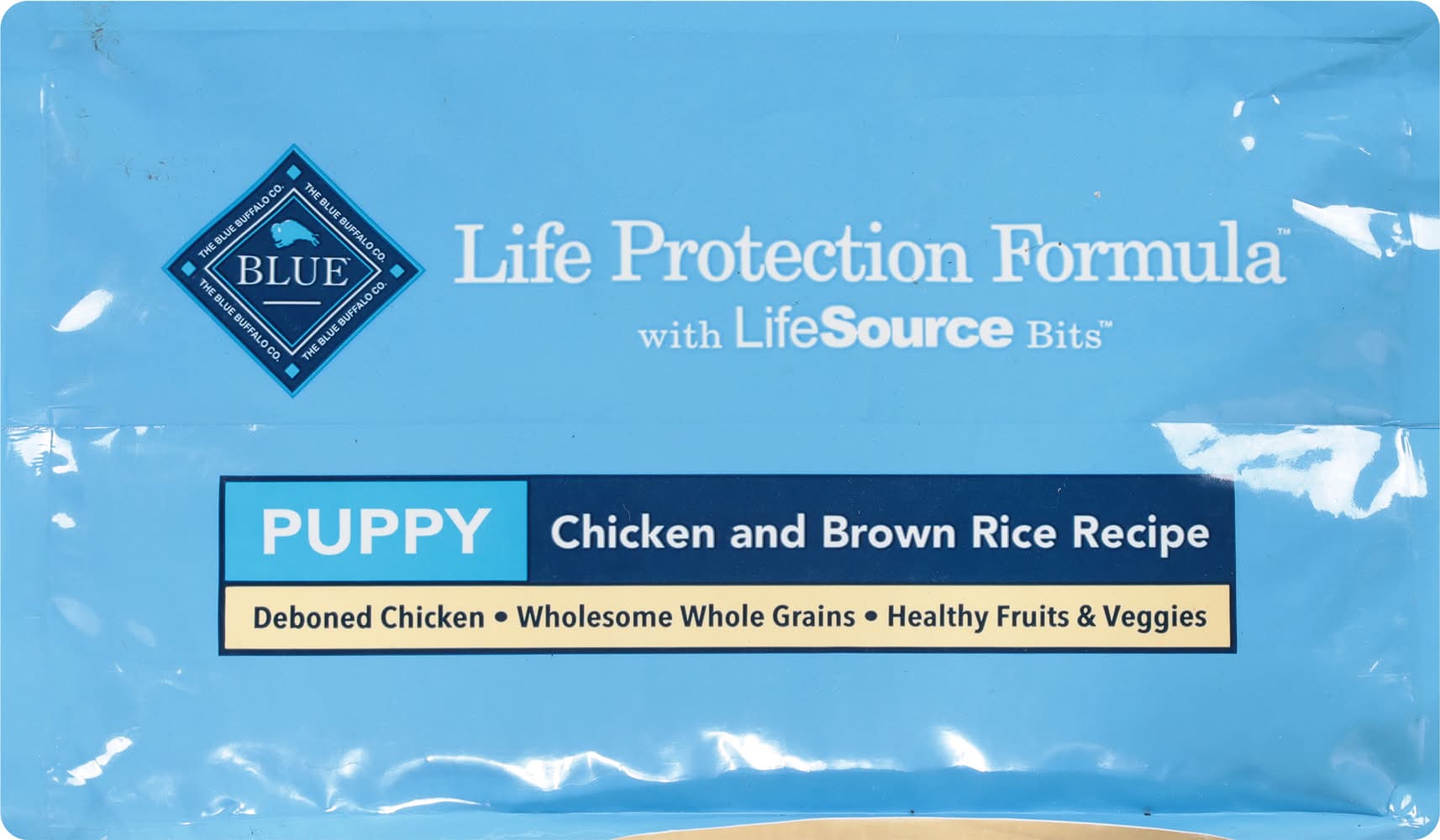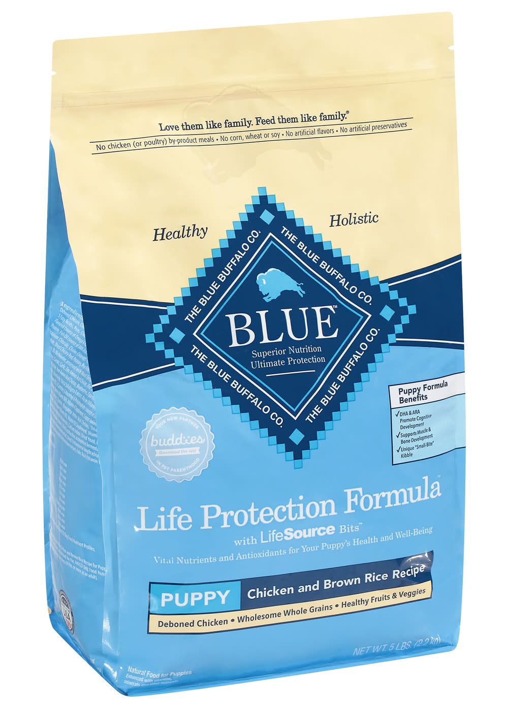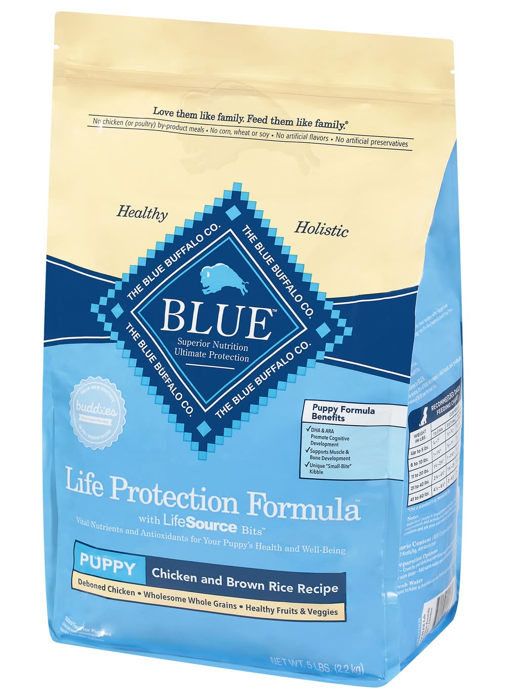 Natural food for puppies enhanced with vitamins, minerals and other nutrients. No corn, wheat or soy. Puppy Formula Benefits: DHA & ARA promote cognitive development. Supports muscle & bone development. Unique small-bite kibble. Life protection formula with Life Source Bits. Vital nutrients and antioxidants for your Puppy's health and well-being. Deboned chicken. Wholesome whole grains. Healthy fruits & veggies. Like you, we think of our dogs as family members. We do all we can to help them live long, happy and healthy lives. That's why we take great care in selecting the finest natural ingredients for every one of our Blue dog foods. Delicious, protein-rich deboned chicken, fish or lamb is the first ingredient, and we never use any chicken (or poultry) by-product meals. When you add wholesome grains and antioxidant support from our exclusive LifeSource Bits, you get the perfect healthy food for your four-legged family member. Antioxidant-Rich LifeSource Bits: Blue exclusive LifeSource Bits are a precise blend of antioxidants, vitamin and minerals selected by veterinarians and animal nutritionists to help support: Immune system health. Life stage requirements. Healthy oxidative balance. And LifeSource Bits are cold-formed to help maintain the potency of their ingredients by minimizing their exposure to heat during processing. Blue Puppy: Chicken & Brown Rice Recipe Benefits: Brain & Eye Development: DHA and ARA, important fatty acids found in mother's milk, along with Choline, support healthy development of cognitive learning and retinal function. Healthy Muscle Growth: High-quality protein from Deboned Chicken, plus Chicken Meal and Egg helps develop strong muscles. Strong Bones & Teeth: A precise blend of Calcium, Phosphorus and essential vitamins helps promote strong bones and teeth. Dental Health: This special small-bite kibble is made for smaller jaws with a crunchy texture to promote tartar removal with chewing. Healthy Skin & Coat: An optimal balance of Omega 3 & 6 Fatty Acids helps promote a shiny coat and healthy skin. • Size: Puppy • Blue Buffalo Company, Ltd., 11 River Road, Wilton, CT, 06897
