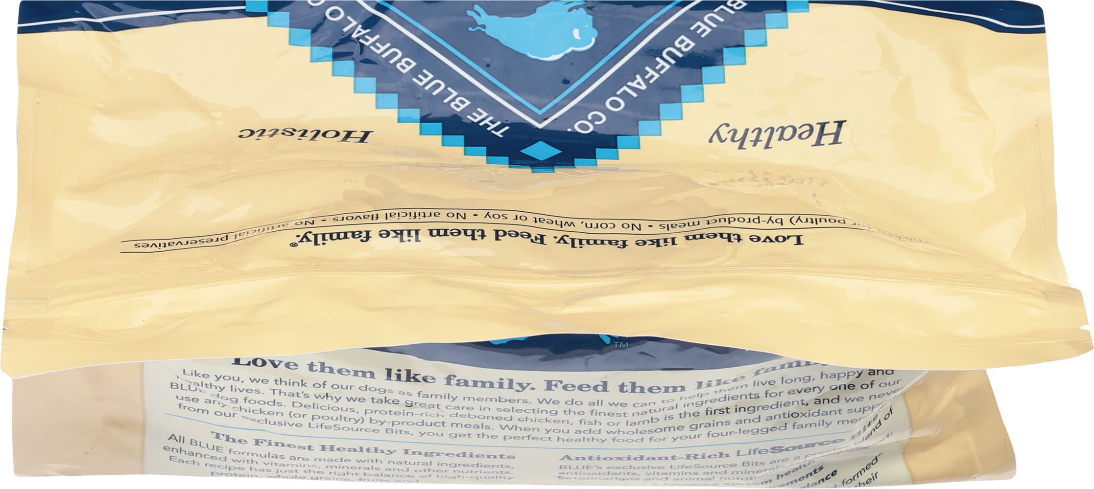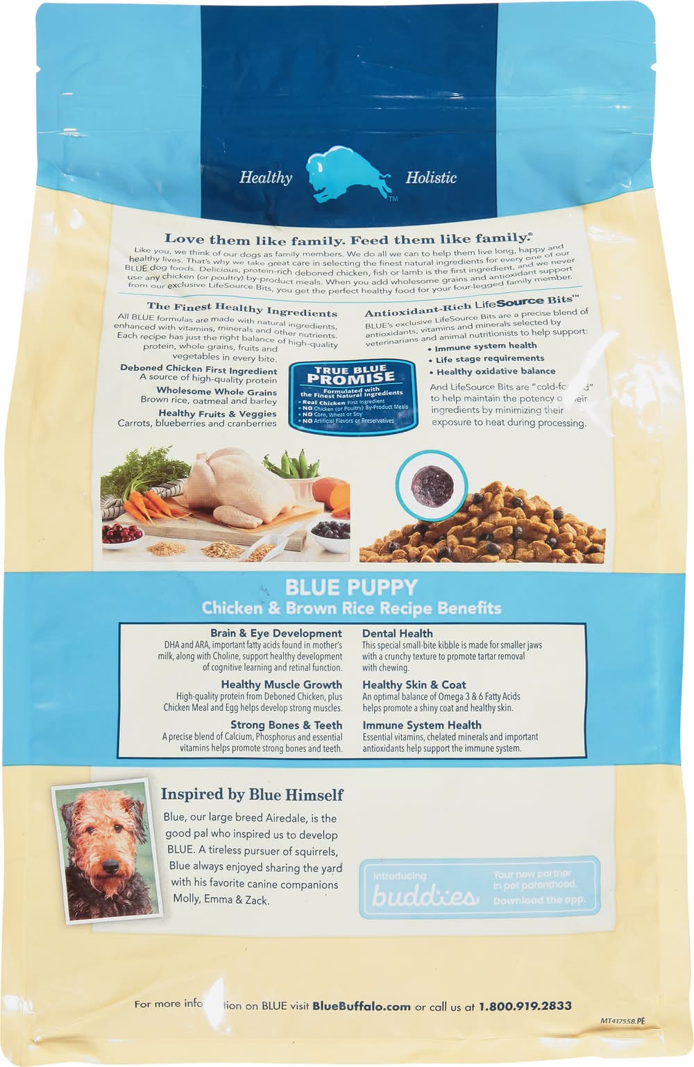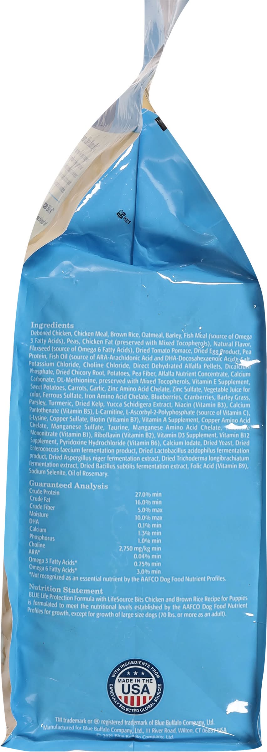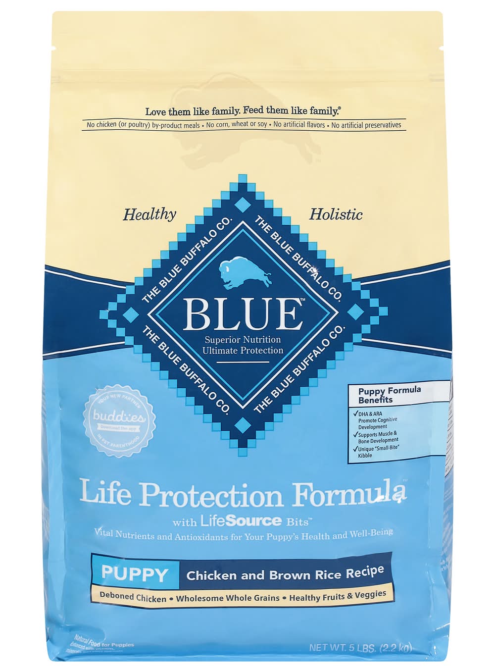 Natural food for puppies enhanced with vitamins, minerals and other nutrients. No corn, wheat or soy. Puppy Formula Benefits: DHA & ARA promote cognitive development. Supports muscle & bone development. Unique small-bite kibble. Life protection formula with Life Source Bits. Vital nutrients and antioxidants for your Puppy's health and well-being. Deboned chicken. Wholesome whole grains. Healthy fruits & veggies. Like you, we think of our dogs as family members. We do all we can to help them live long, happy and healthy lives. That's why we take great care in selecting the finest natural ingredients for every one of our Blue dog foods. Delicious, protein-rich deboned chicken, fish or lamb is the first ingredient, and we never use any chicken (or poultry) by-product meals. When you add wholesome grains and antioxidant support from our exclusive LifeSource Bits, you get the perfect healthy food for your four-legged family member. Antioxidant-Rich LifeSource Bits: Blue exclusive LifeSource Bits are a precise blend of antioxidants, vitamin and minerals selected by veterinarians and animal nutritionists to help support: Immune system health. Life stage requirements. Healthy oxidative balance. And LifeSource Bits are cold-formed to help maintain the potency of their ingredients by minimizing their exposure to heat during processing. Blue Puppy: Chicken & Brown Rice Recipe Benefits: Brain & Eye Development: DHA and ARA, important fatty acids found in mother's milk, along with Choline, support healthy development of cognitive learning and retinal function. Healthy Muscle Growth: High-quality protein from Deboned Chicken, plus Chicken Meal and Egg helps develop strong muscles. Strong Bones & Teeth: A precise blend of Calcium, Phosphorus and essential vitamins helps promote strong bones and teeth. Dental Health: This special small-bite kibble is made for smaller jaws with a crunchy texture to promote tartar removal with chewing. Healthy Skin & Coat: An optimal balance of Omega 3 & 6 Fatty Acids helps promote a shiny coat and healthy skin. • Size: Puppy • Blue Buffalo Company, Ltd., 11 River Road, Wilton, CT, 06897