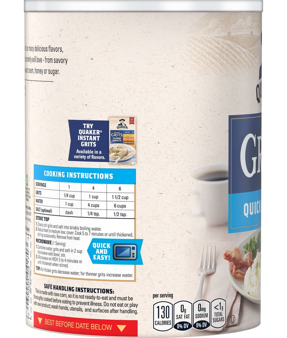 Quaker Original Quick Grits cook in just 5 minutes. We know you want to give your family the very best, and a warm bowl of Quaker Grits gives them a delicious start. Breakfast is a time-honored tradition, so don't forget the grits!