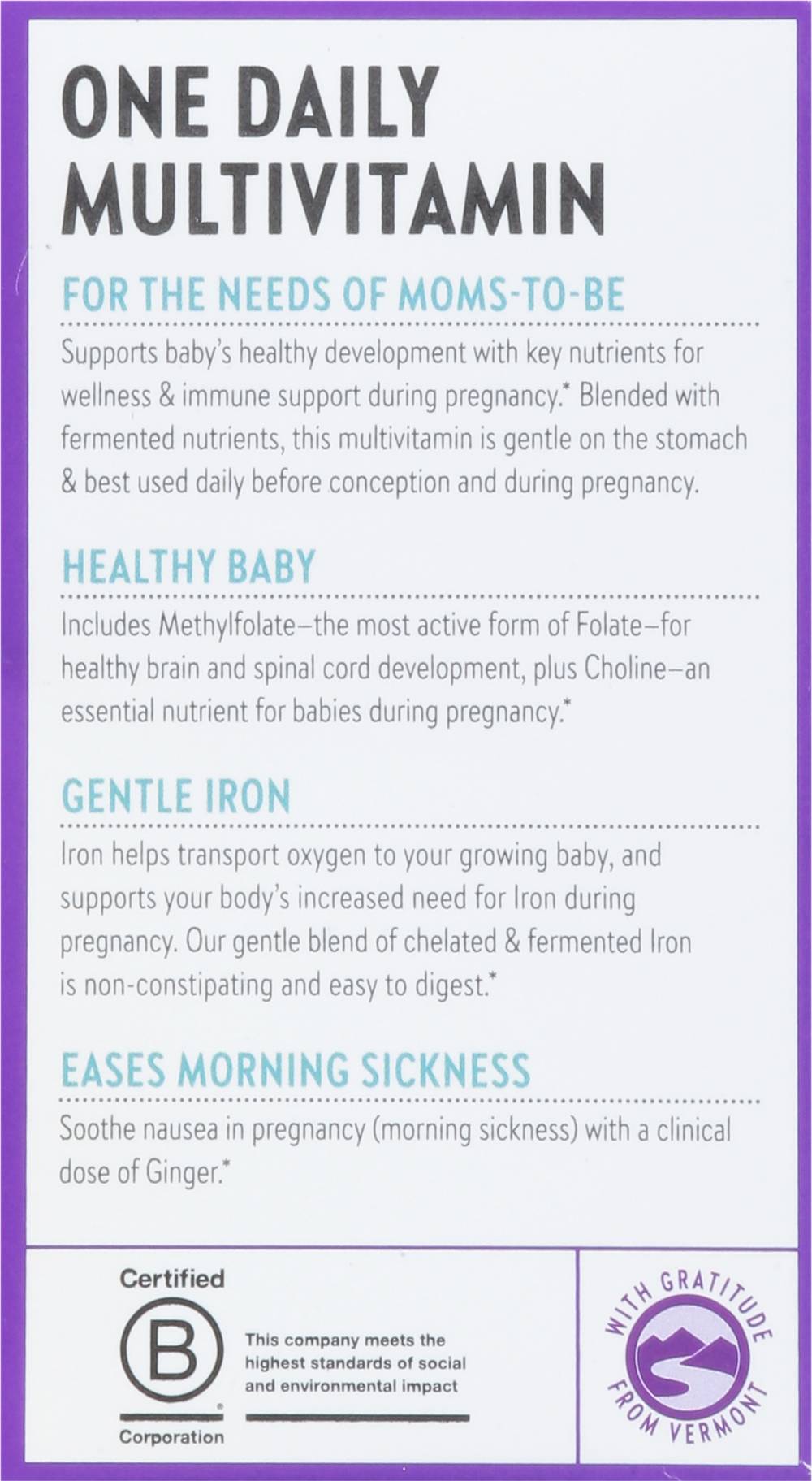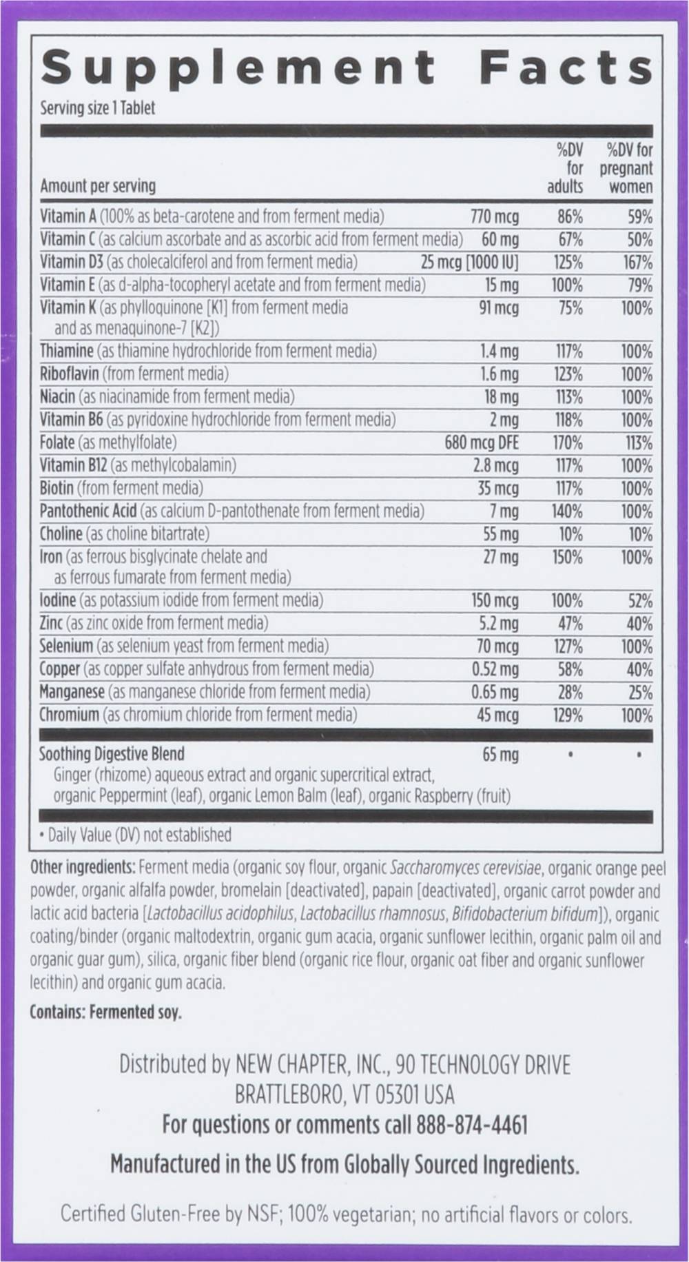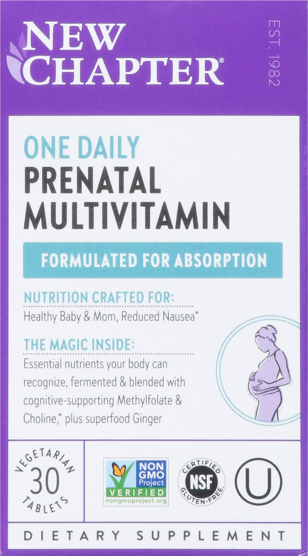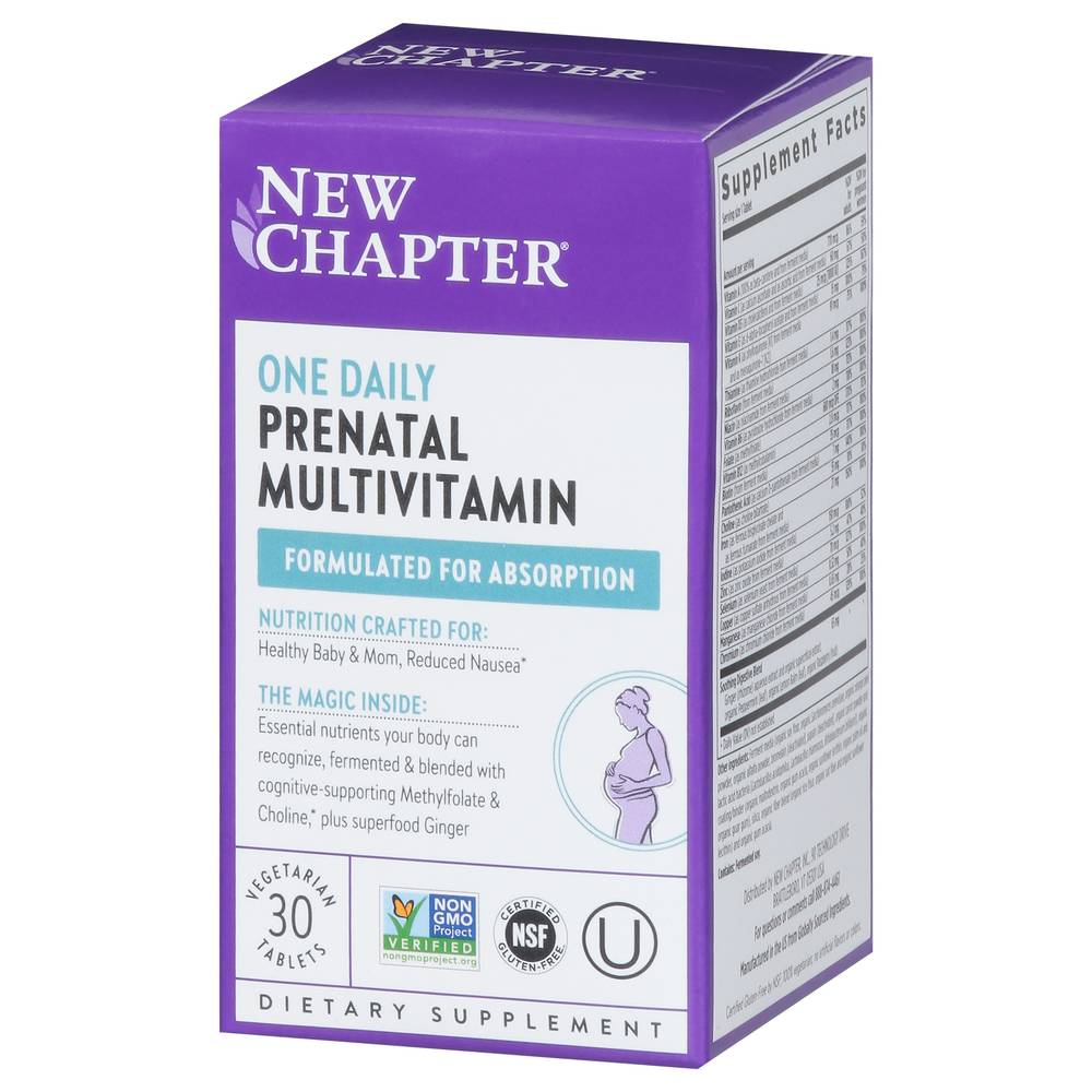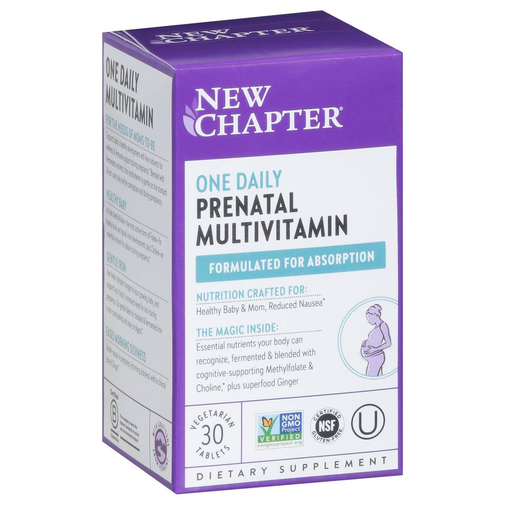 Dietary Supplement. NSF: Certified gluten free. Certified gluten-free by NSF; 100% vegetarian; no artificial flavors or colors. Non-GMO Project verified. nongmoproject.org. Est. 1982. Formulated for absorption. Nutrition Crafted for: Health baby & mom, reduced nausea. The Magic Inside: Essential nutrients your body can recognize, fermented & blended with cognitive-supporting Methylfolate & choline, plus superfood ginger. Absorb the Good Stuff: We fine-tune the levels of each high-quality vitamin & mineral, choose types that work best with the body, and ferment key nutrients with probiotics and whole foods. One daily multivitamin. For the needs of moms-to-be: Supports baby's healthy development with key nutrients for wellness & immune support during pregnancy. Blended with fermented nutrients, this multivitamin is gentle on the stomach & best used daily before conception and during pregnancy. Healthy Baby: Includes Methylfolate - the most active form of folate - for healthy brain and spinal cord development, plus choline - an essential nutrient for babies during pregnancy. Gentle Iron: Iron helps transport oxygen to your growing baby, and supports your body's increased need for iron during pregnancy. Our gentle blend of chelated & fermented iron is non-constipating and easy to digest. Eases morning sickness: Soothe nausea in pregnancy (morning sickness) with a clinical dose of ginger. With gratitude from Vermont. The New Chapter Money-Back Guarantee: We proudly stand behind every product we make. However, if you are not satisfied, please visit www.newchapter.com/guarantee for refund details. www.newchapter.com For questions or comments call 888-874-4461. Certified B Corporation: This company meets the highest standards of social and environmental impact. Please recycle this box after use. (These statements have not been evaluated by the Food and Drug Administration. This product is not intended to diagnose, treat, cure, or prevent any disease.) Manufactured in the US from globally sourced ingredients. New Chapter, Inc., Brattlebro, VT, 05301, Ph: 888-874-4461