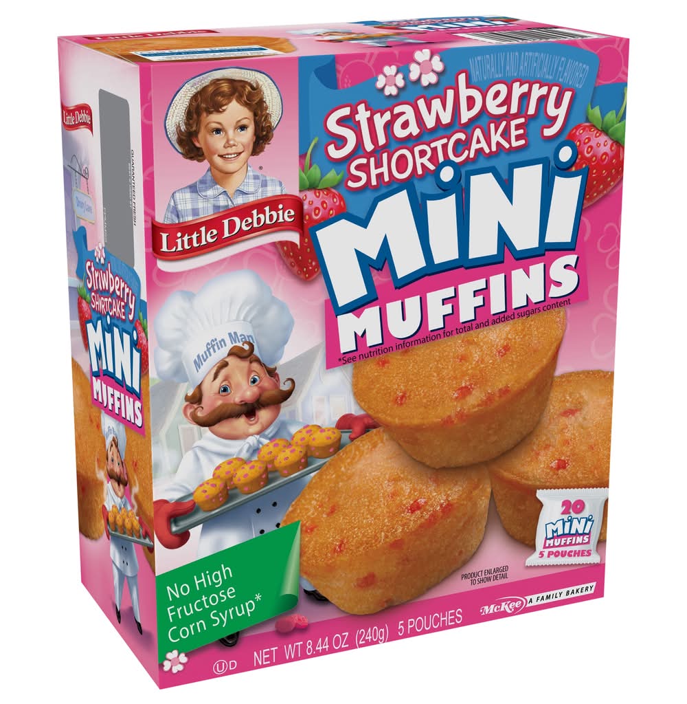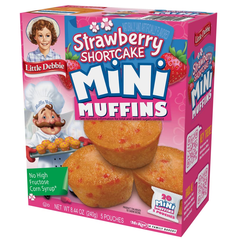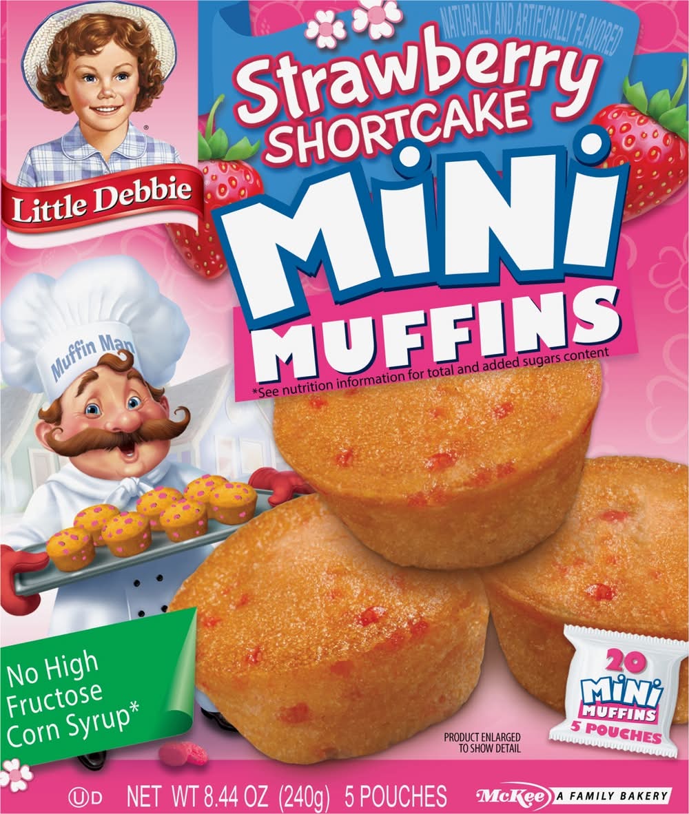 Naturally & artificially flavored. No high fructose corn syrup (See nutrition information for total and added sugars content). Contains a bioengineered food ingredient. 20 mini muffins. 5 pouches. McKee: A family bakery. S is for strawberry! The muffin man is busy in the kitchen! Can you find 14 objects starting with the letter s in this scene? Then find and count 18 strawberries scattered about! "The muffin man". Answer: salt shaker, spatula, stools, spoon, sink, skillet, shelf, sponge, scissors, sifter, sugar bowl, sunshine, soap suds, stove. Our Family Promise: Quality, freshness and taste. littledebbie.com; 1-800-522-4499. McKee Foods, Collegedale, TN 37315. Send or have available the dated end panel. Guaranteed fresh. MiniMuffins.com/MuffinMan. littledebbie.com. Download your free eBook! Hey There! Scan now for delicious Mini Muffin content! Hola! scan now for delicious Mini Muffin content. Visit us at: MiniMuffins.com/MuffinMan. Download your free ebook! Do you know. How I got my name? Story by Melody Delgade. Illustrated by Jim Talbot. Visit us at: minimuffins.com/muffinman. Please recycle this carton.