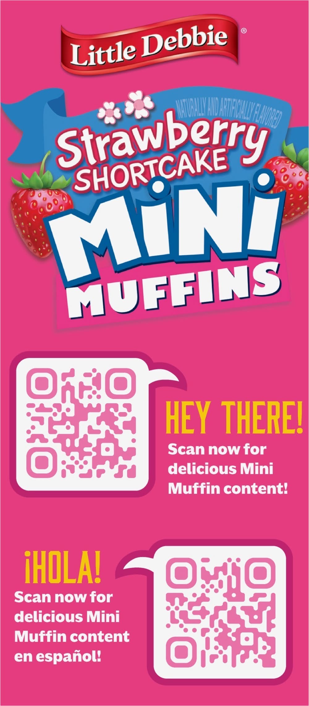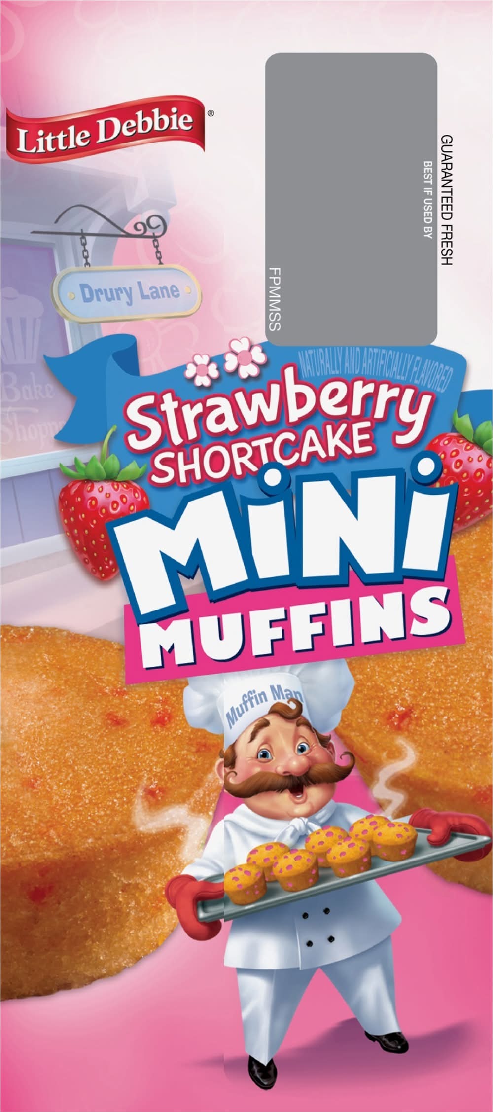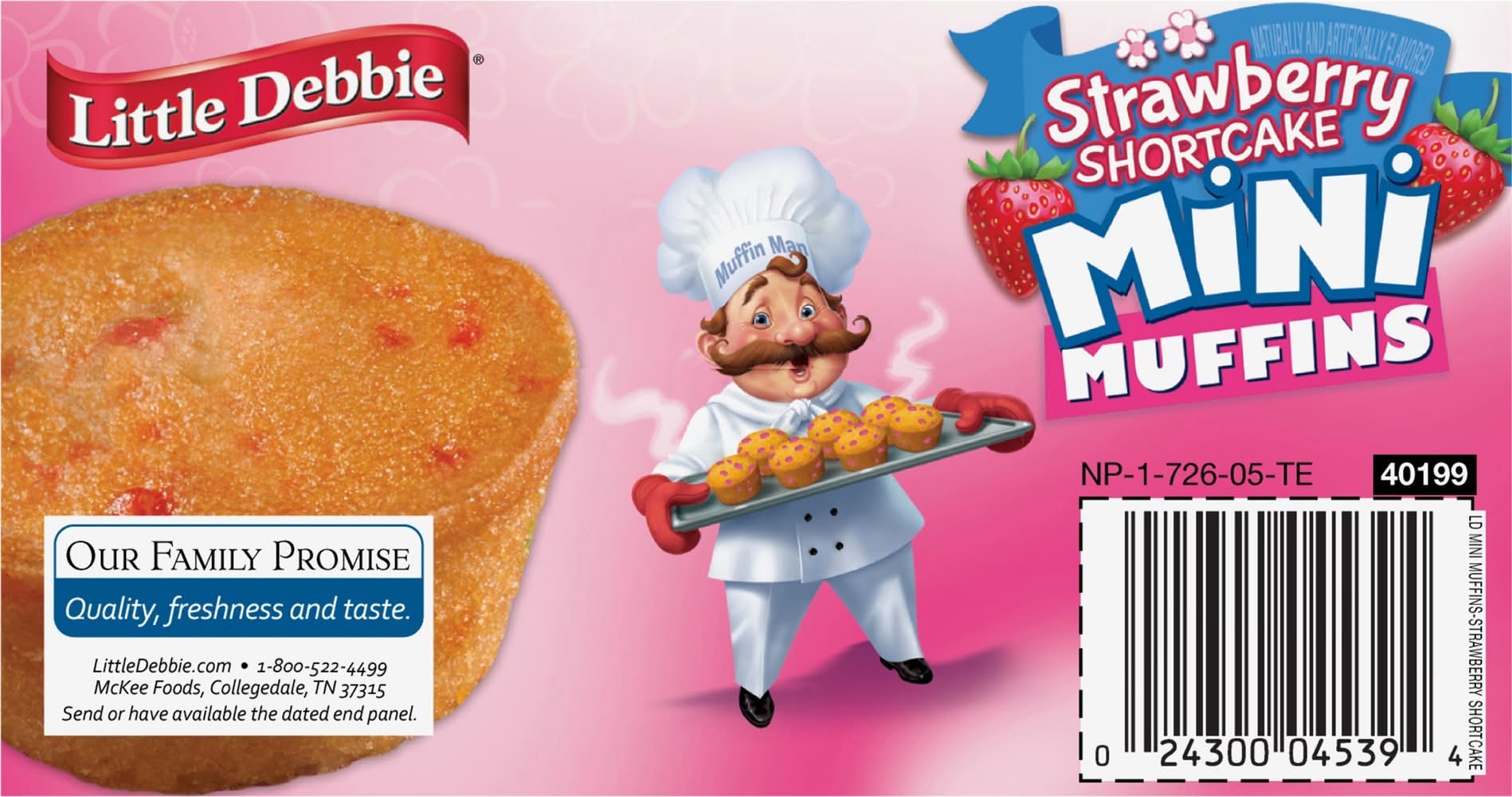 Naturally & artificially flavored. No high fructose corn syrup (See nutrition information for total and added sugars content). Contains a bioengineered food ingredient. 20 mini muffins. 5 pouches. McKee: A family bakery. S is for strawberry! The muffin man is busy in the kitchen! Can you find 14 objects starting with the letter s in this scene? Then find and count 18 strawberries scattered about! "The muffin man". Answer: salt shaker, spatula, stools, spoon, sink, skillet, shelf, sponge, scissors, sifter, sugar bowl, sunshine, soap suds, stove. Our Family Promise: Quality, freshness and taste. littledebbie.com; 1-800-522-4499. McKee Foods, Collegedale, TN 37315. Send or have available the dated end panel. Guaranteed fresh. MiniMuffins.com/MuffinMan. littledebbie.com. Download your free eBook! Hey There! Scan now for delicious Mini Muffin content! Hola! scan now for delicious Mini Muffin content. Visit us at: MiniMuffins.com/MuffinMan. Download your free ebook! Do you know. How I got my name? Story by Melody Delgade. Illustrated by Jim Talbot. Visit us at: minimuffins.com/muffinman. Please recycle this carton.