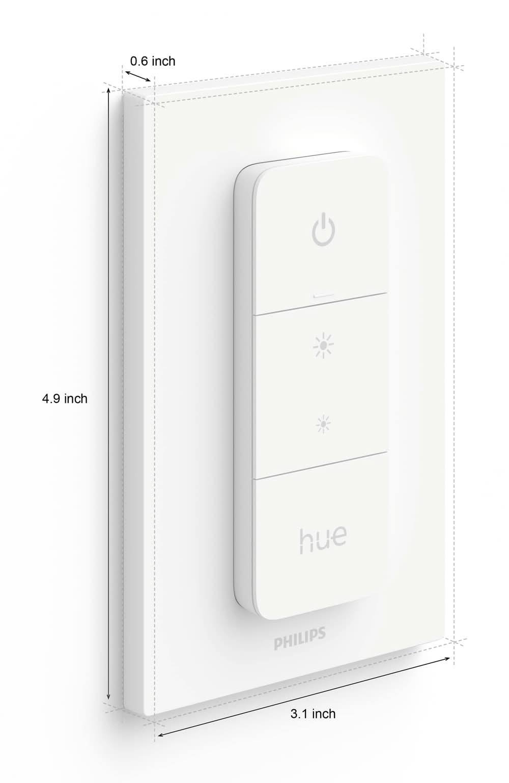 This Philips Hue Dimmer switch makes it easy for anyone in the home to control Hue smart lights with a touch of a button, whether or not they have the Hue app or a voice device handy. The dimmer switch adds more convenient ways to control your Hue lights whether for guests, kids, or even yourself. The dimmer switch lets you turn lights on or off, dim or brighten, or toggle between four of your favorite light scenes. You can also get the best light based on the time of the day, perfect for tuning light to your circadian rhythmn. Three clearly marked buttons make the dimmer switch simple to use. With it's battery-powered design and the included adhesive, the dimmer switch can be placed anywhere. The long-lasting battery has a minimum lifetime of 3 years. It's magnetic backing even lets you attach it to the refrigerator or other metal surfaces. A Hue Bridge and Hue lights (sold separately) are required to connect the dimmer switch to your Hue set-up. The Bridge unlocks the full power of Hue smart home lighting by unlocking features like multiple room control, out-of-home control, automations and more. Color: White